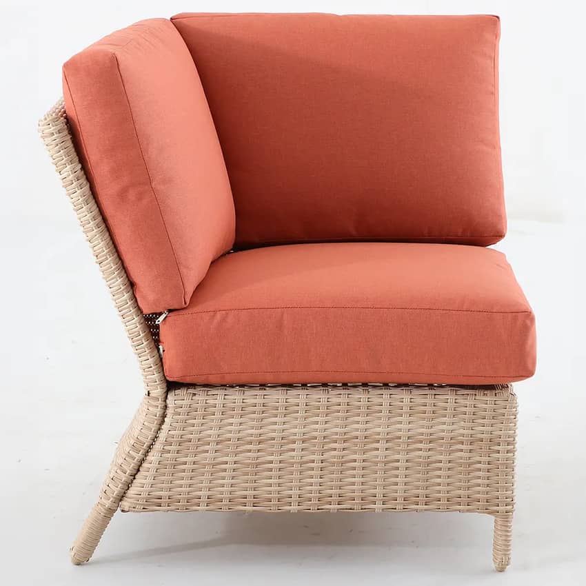 The Hampton Bay Camden Point Resin Wicker Sectional Dining 4-Piece Set in Tan and Orange is the perfect addition to your outdoor living space. The durable, weather-resistant resin wicker construction and powder-coated steel frame ensure long-lasting quality. The hand-woven wicker design adds a touch of elegance, while the comfortable cushions provide ultimate relaxation. The set includes a left-arm sofa, a right-arm sofa, a corner chair, and a table, offering ample seating and dining space. The easy-to-clean cushions and weather-resistant fabric make maintenance a breeze. With its stylish design and durable construction, this sectional set is sure to enhance your outdoor living experience. The left and right arm sofas measure 32.08 inches deep, 49.4 inches wide, and 30.90 inches high, the table measures 39.17 inches deep, and 28.54 inches high, and the corner chair measures 32.08 inches deep, 32.08 inches wide, and 30.90 inches high.
