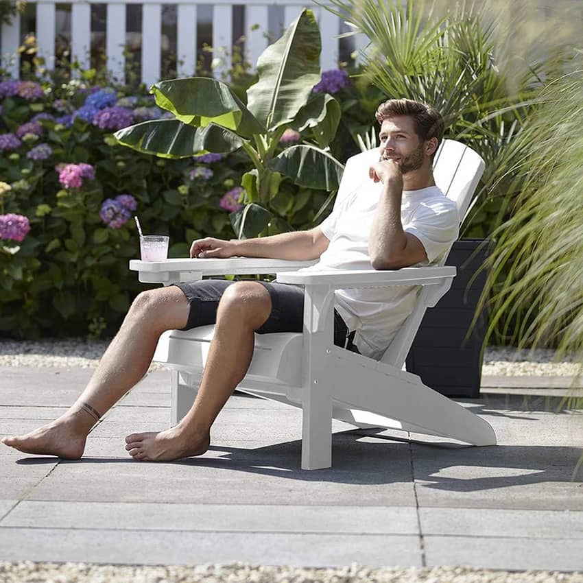 Relax in timeless style and comfort with the Keter Outdoor Resin Adirondack Chair in White. Crafted from durable, rust-proof, all-weather polypropylene resin, this chair offers exceptional longevity, resisting warping, dents, rot, and fading far better than real wood. Designed for ultimate relaxation, it features a convenient cup holder built directly into the armrest, making it ideal for poolside lounging, beach days, or gathering around the fire pit. This chair provides comfortable lounge seating and boasts a solid 350-pound weight capacity. Lightweight and easy to rearrange, it comes ready to assemble with clear instructions, allowing you to add a comfortable seat to your outdoor space. This chair weighs 24 pounds and measures 39.8 inches long, 31.9 inches wide, and 39.8 inches high.