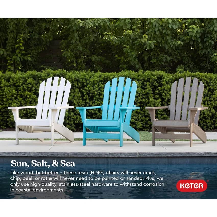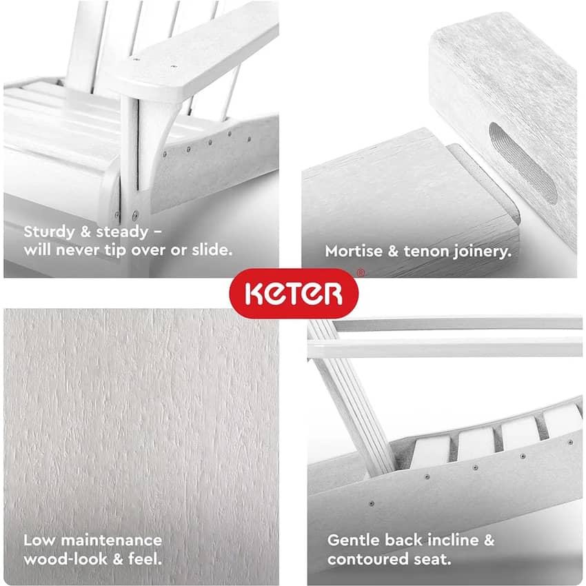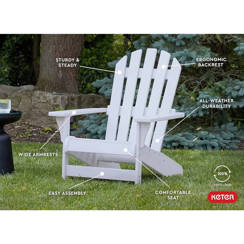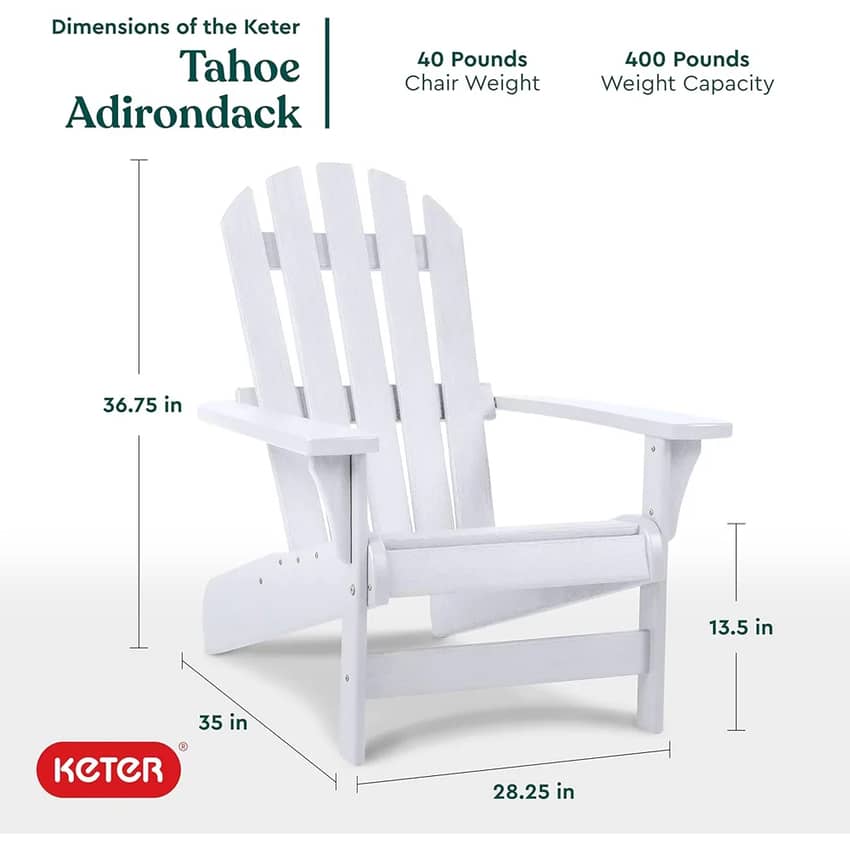 Kick back and relax in style with the Keter Tahoe Adirondack Chair in White! Made in the USA with pride, this all-weather chair is built to last a lifetime. Constructed from a durable, rust-proof resin that includes recycled materials, this chair is not only eco-friendly but also exceptionally strong. The wide lumber profile ensures stability, so you won't have to worry about tipping over. Unlike traditional wooden Adirondack chairs, this Keter chair boasts weatherproof resin HDPE that resists warping, dents, and splintering � all while maintaining the rich textural look of wood. The wide arms offer a convenient spot for your drink or a book, while the tall ergonomic back provides ultimate comfort for lounging. With a weight capacity of 400 pounds, this chair is perfect for many body types. Easy assembly with mortise and tenon joinery creates a sturdy and stylish chair with minimal hardware. Plus, color-matched fasteners create a seamless look. This versatile chair can be used anywhere you need a comfortable spot to relax � by the fire pit, on the front porch, patio, balcony, or even poolside. The Keter Tahoe weighs 40 pounds and measures 28.25 inches long, 35 inches wide, and 36.75 inches high.