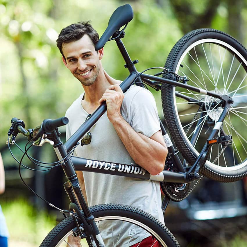 The Royce Union Men's RMT all-terrain mountain bike is durable, versatile, and affordable. The 22-inch aircraft-grade aluminum hardtail frame is lightweight and rust-resistant and handles a variety of terrain, from smooth trails to bumpy city streets. The bike is equipped with a 21-speed Shimano REVOSHIFT twist shifter and Shimano Tourney indexed rear derailleur, which provides a wide range of gears for climbing hills or cruising on flat ground. The alloy linear-pull brakes provide smooth and reliable stopping power, and the ZOOM suspension fork absorbs bumps and shocks for a comfortable ride. Other features include Krayton grips for a comfortable grip, an adjustable padded seat, and adjustable handlebars. The bike also has a removable rear derailleur guard to protect the gears from damage. It weighs 39.6 pounds and measures 53.9 inches long, 9.6 inches wide, and 30.3 inches high.