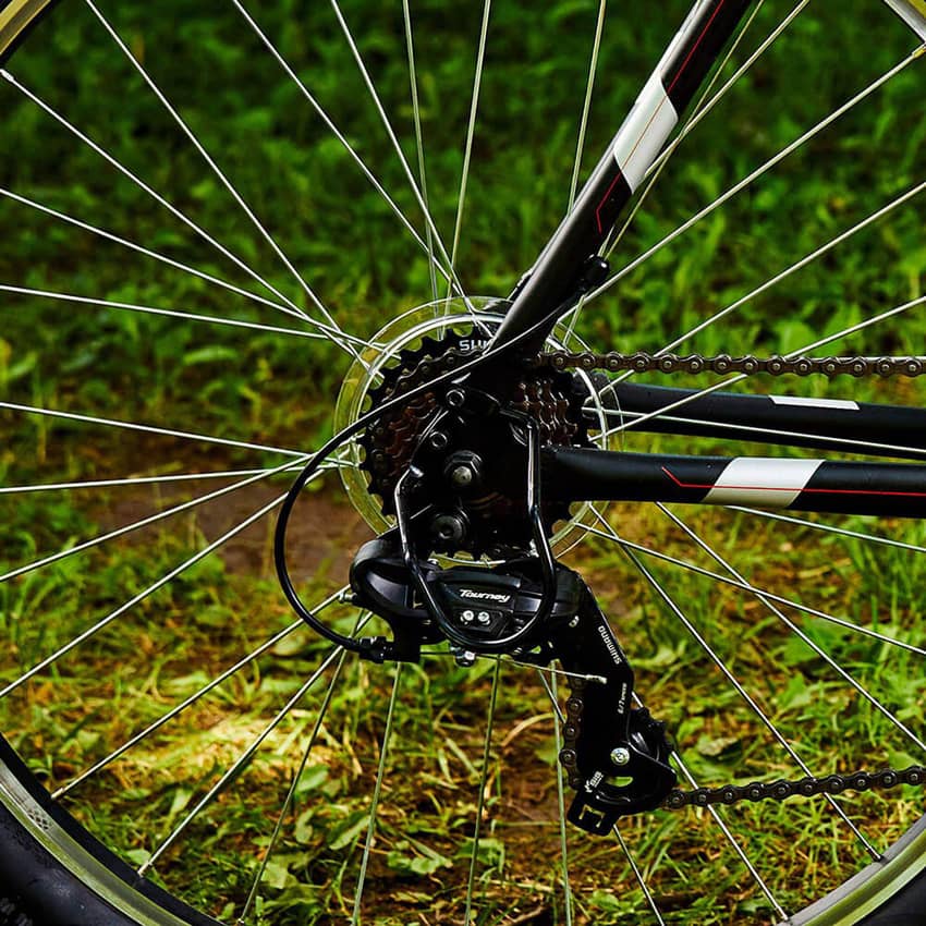 - 21-speed Shimano REVOSHIFT twist shifters and Shimano Tourney indexed rear derailleur