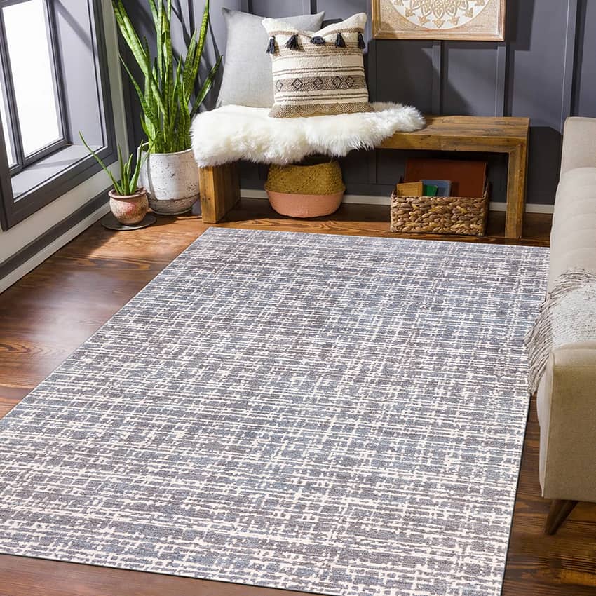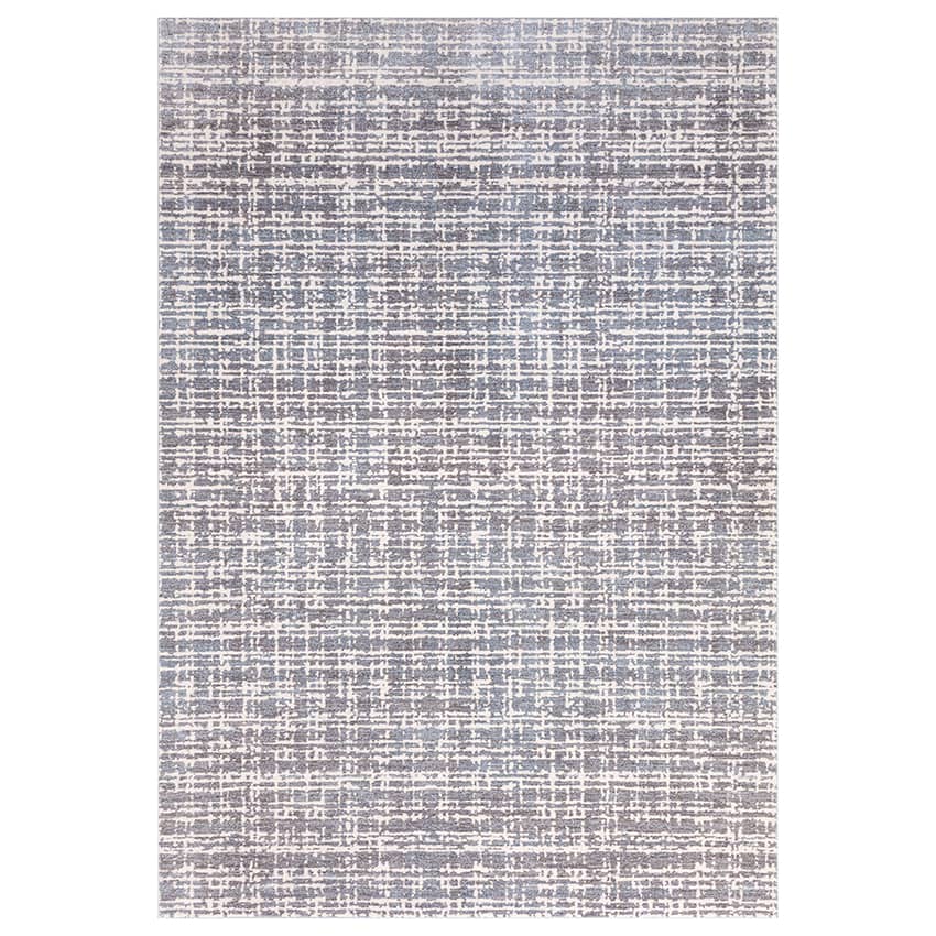 The Hazel Collection Grid Area Rug in Blue, Ivory, and Gray is a luxurious and durable addition to any home. Its super soft 100% polyester pile provides a plush and comfortable underfoot experience, while the cotton backing adds durability and stability. This rug is fade-resistant and stain-resistant, ensuring long-lasting beauty. The anti-static properties help to prevent dust and pet hair from accumulating, making it easy to keep clean. Made in Turkey with a pile height of 10 millimeters, the Hazel Collection rug is a stylish and practical choice for any room in your home. This rug measures 9 feet wide and 12 feet long.