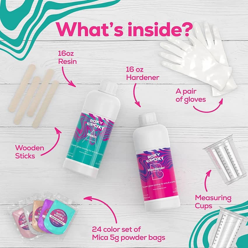 - What's included: 16 oz Resin, 16 oz Hardener, Wooden sticks, 24 color set of Mica 5g powder bags, Measuring Cups, A pair of gloves