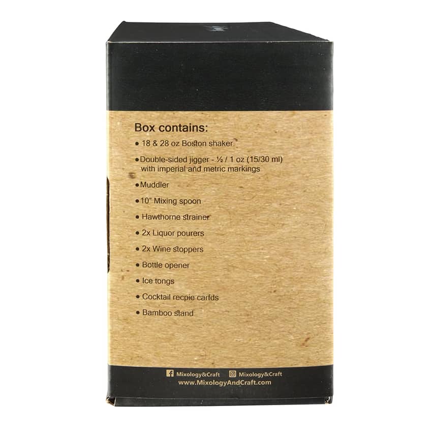 - Full Set: Upgrade your happy hour with our 13-piece bar kit that includes a leak-proof Boston shaker, ice tongs, bottle opener, wooden stand, mixing spoon, strainer, muddler, jigger, pourers, stoppers, and even recipe cards