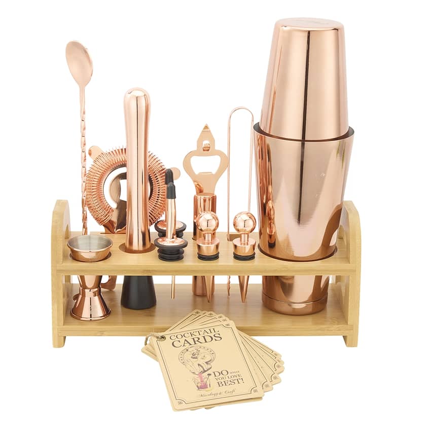 Mixology & Craft 13-Piece Bar Set with Bamboo Stand, Copper Finish