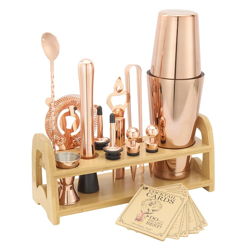 Elevate your home bartending with the Mixology & Craft 13-Piece Bar Set in a stunning Copper Finish, the ultimate kit for both amateur enthusiasts and professional mixologists. This comprehensive set includes every tool you need to craft impressive cocktails, featuring a leak-proof Boston shaker, ice tongs, a mixing spoon, a strainer, a muddler, a jigger, pourers, stoppers, a bottle opener, and a stylish bamboo stand for organized display. Built for longevity, this durable set is designed to remain rust and leak-free for years of shaking and stirring, while hand washing is recommended to maintain its quality. Complete with drink recipe cards, this beautiful kit is the perfect gift to upgrade anyone's happy hour.