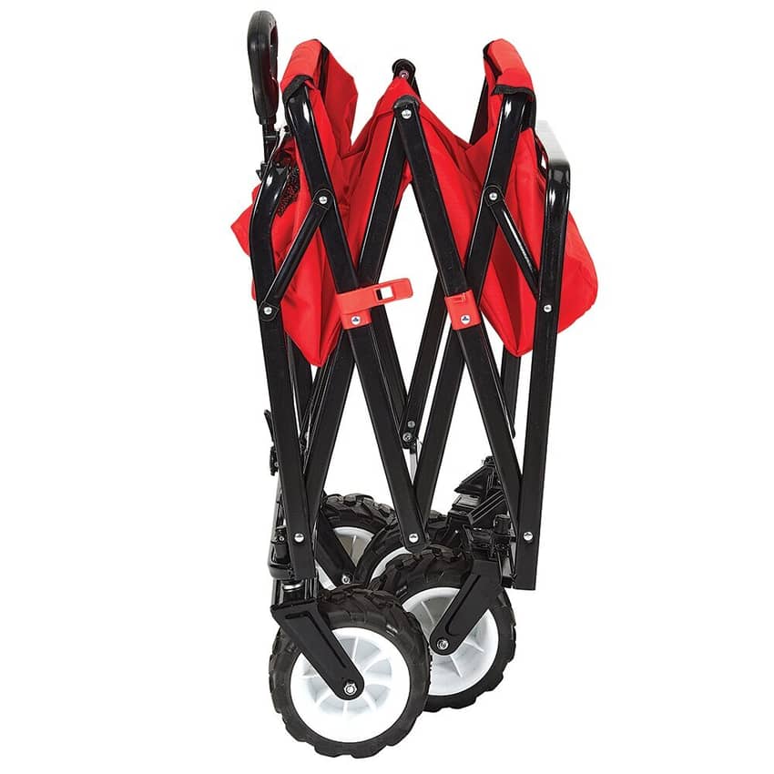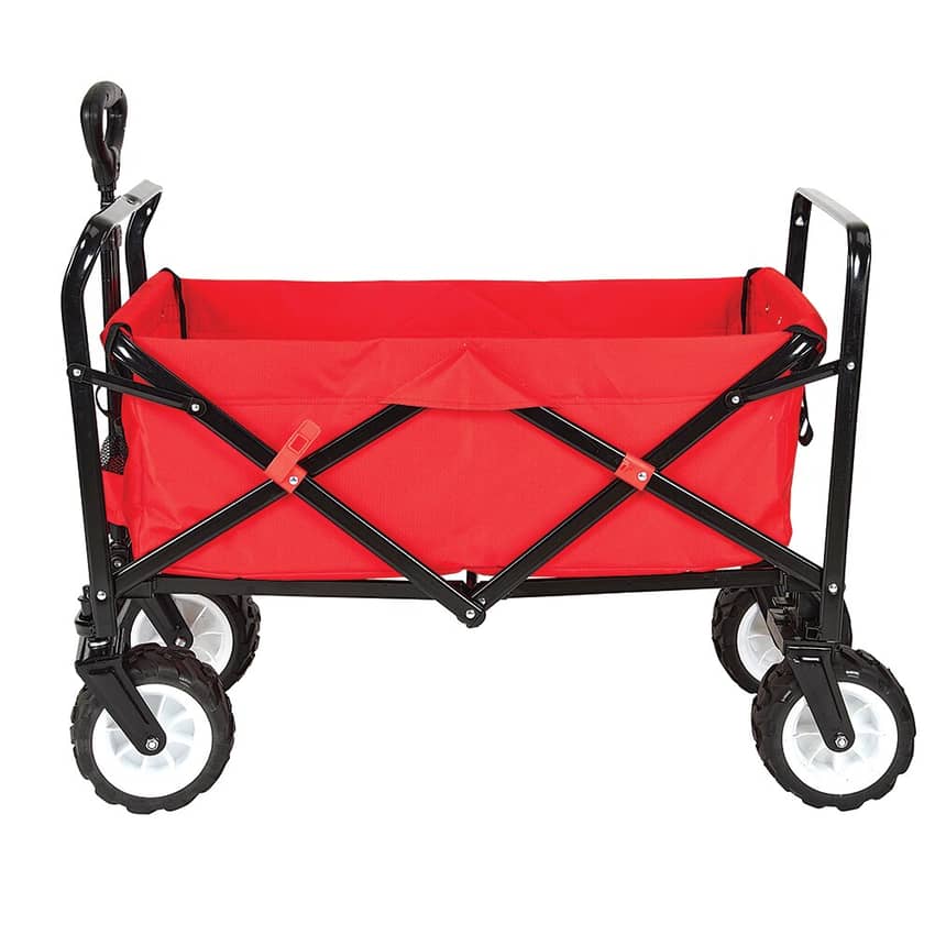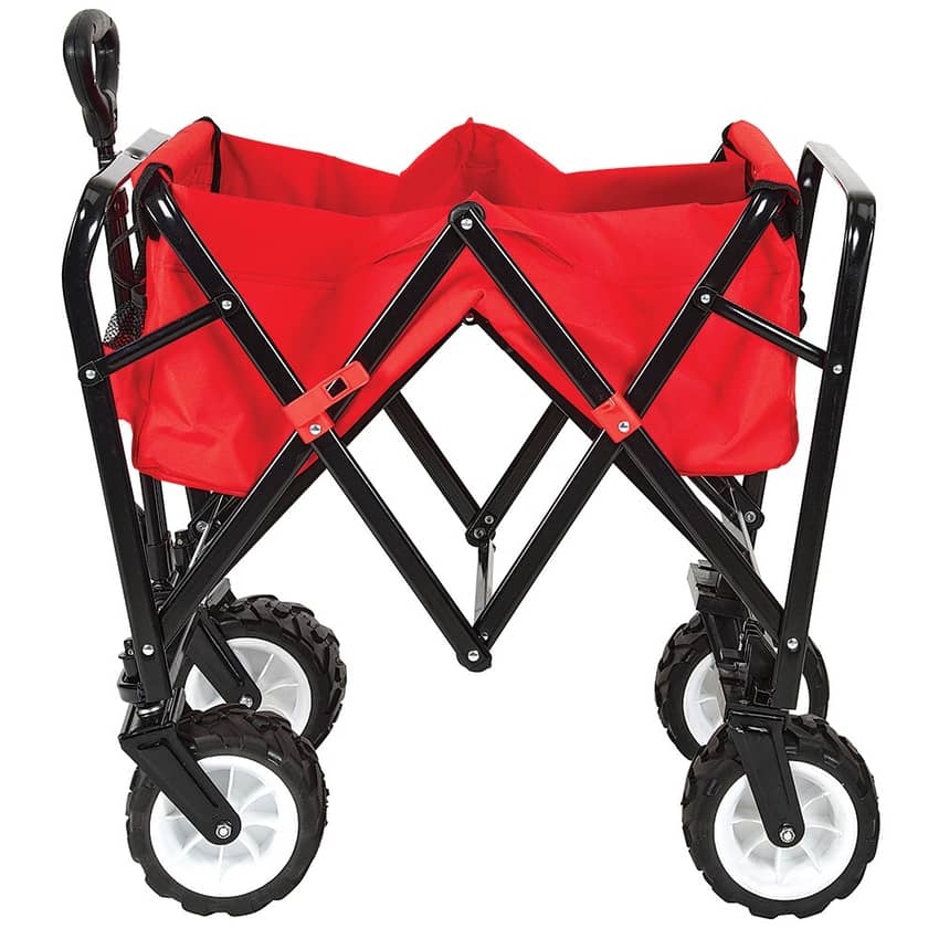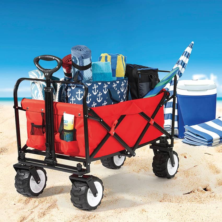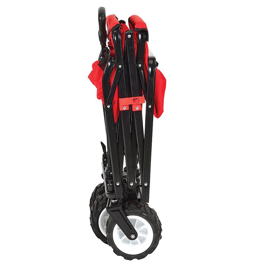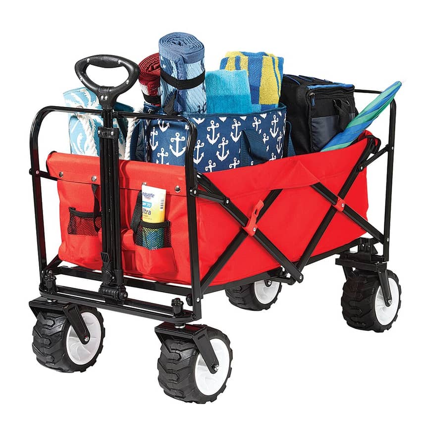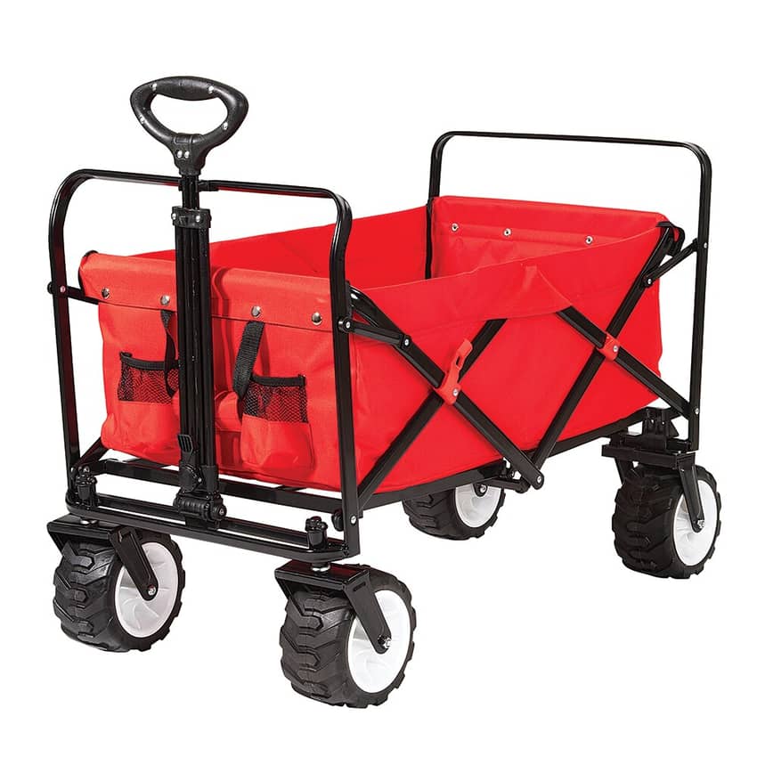 Cart your gear or your kids around with our folding all-terrain wagon! This wagon conveniently folds for transport and storage. The strong steel frame and thick polyester fabric can hold 264 pounds, so go ahead and fill it up with everything you need for a day at the beach, amusement park -- or take it camping! Extra-large wheels make rolling over sand and uneven ground easy. The telescoping handle expertly controls the front-swivel wheels for extra maneuverability.