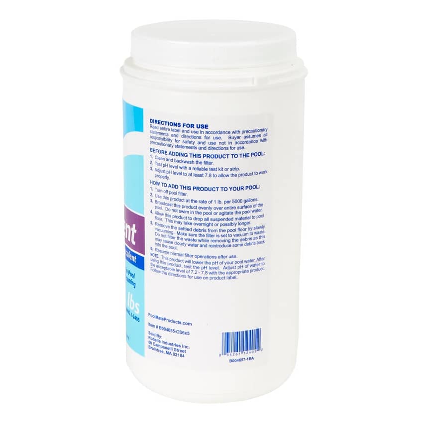 Pool Mate Granular Flocculent is a powerful solution for clearing cloudy pool water. This 5-pound container of granular flocculent works by effectively binding together suspended particles that cause turbidity, causing them to settle to the pool's bottom. Once settled, these particles can be easily vacuumed away, leaving your pool water crystal clear. This simple and effective treatment provides a quick and efficient way to restore the sparkling clarity of your pool.