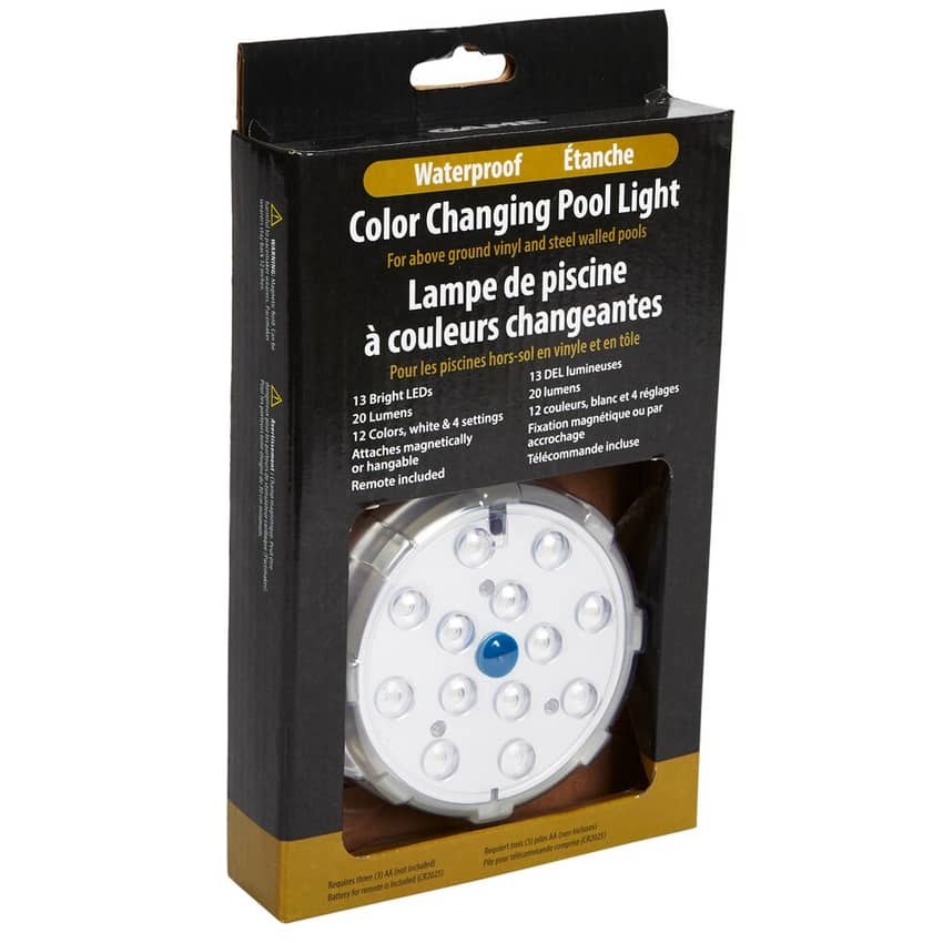 This waterproof, color-changing pool light instantly transforms your above-ground vinyl or steel-walled pool into a vibrant aquatic display. Featuring 13 bright LEDs and 20 lumens, it offers a spectrum of colors controlled by an included remote, allowing you to set the perfect mood. Its versatile design allows for magnetic attachment or hanging, providing flexible placement options. Enjoy a mesmerizing light show and enhance your pool experience with this easy-to-install and user-friendly pool light.