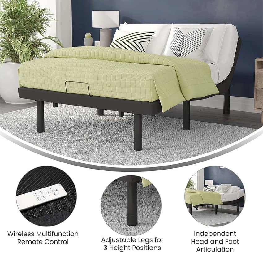 - Independent head and foot recline and adjustable legs for 3 height options, 6.5", 9.5", and 11.5"; Head elevates from 0° - 57° and foot elevates from 0° - 40°
