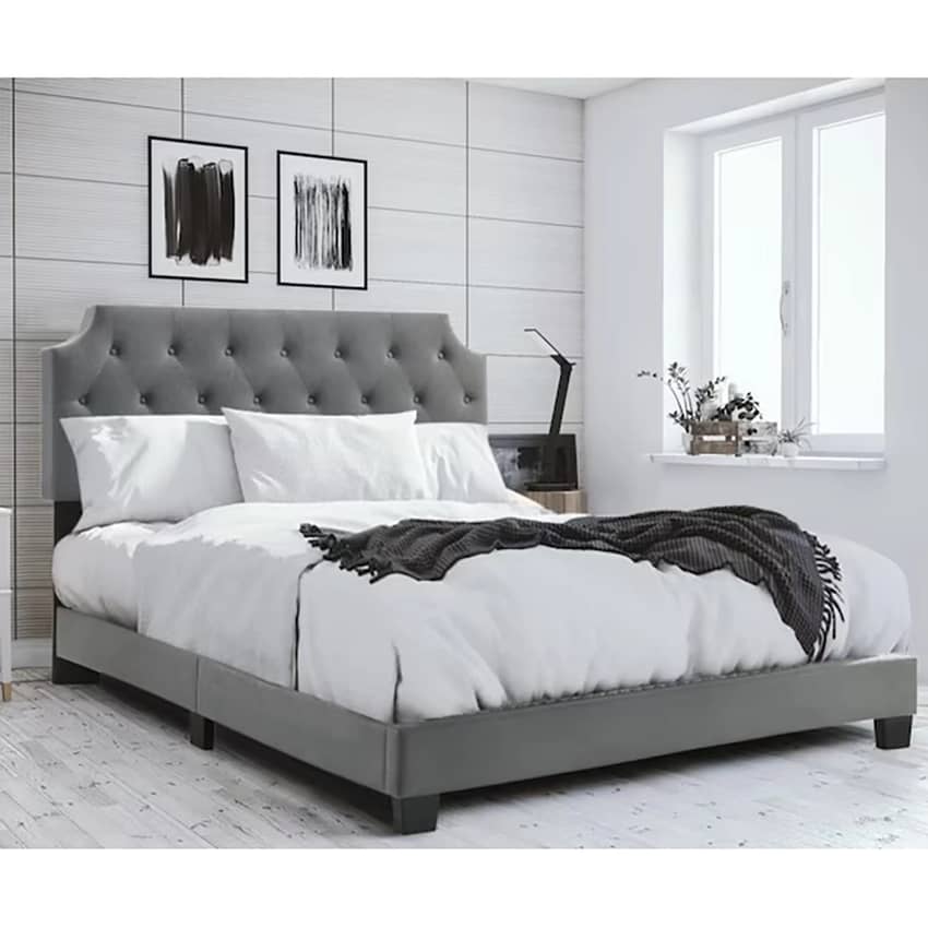 Infuse your bedroom with modern sophistication and convenience with the Belle Isle Furniture Regal Tufted Bed in a rich Gray hue. This Full-size bed makes a stunning centerpiece, artfully upholstered in plush velvet fabric and accentuated with elegant tufted accents for extra visual appeal. More than just stylish, it is designed for contemporary living, featuring two built-in USB ports for charging your electronic devices right at your bedside. This luxurious bed requires assembly and a box spring (not included) to complete your comfortable and connected sleeping space and measures 76 inches long, 60 inches wide, and 52 inches high.