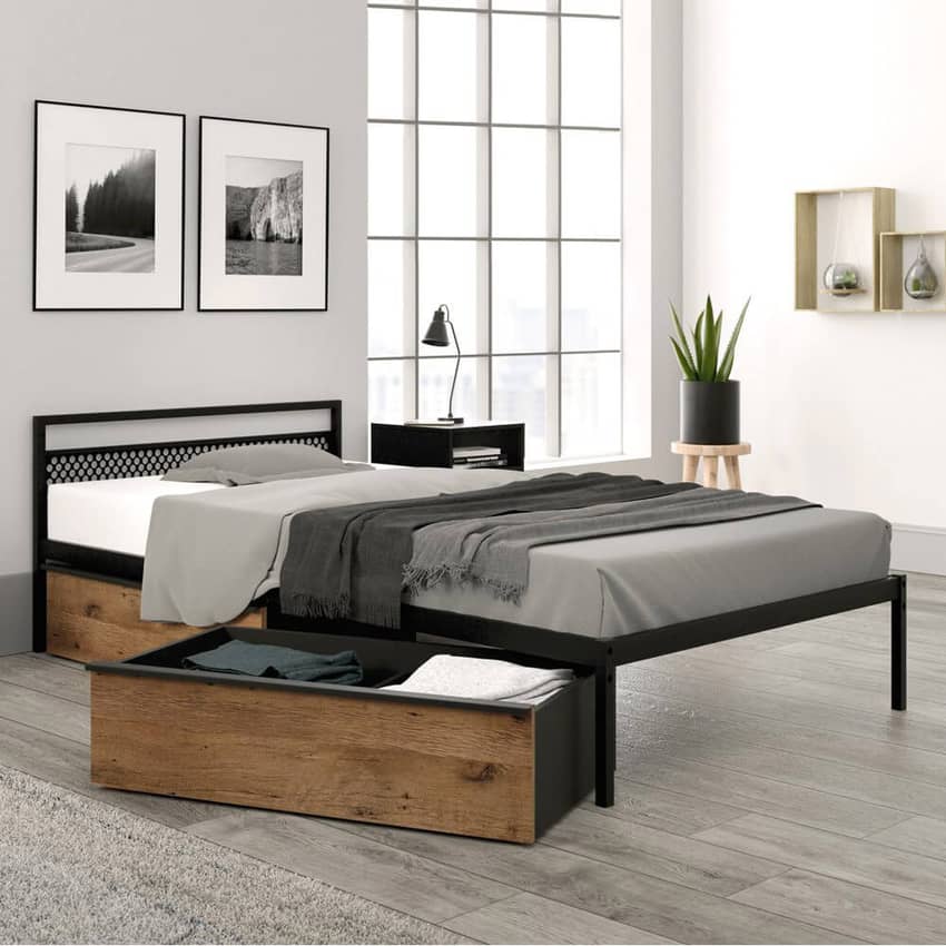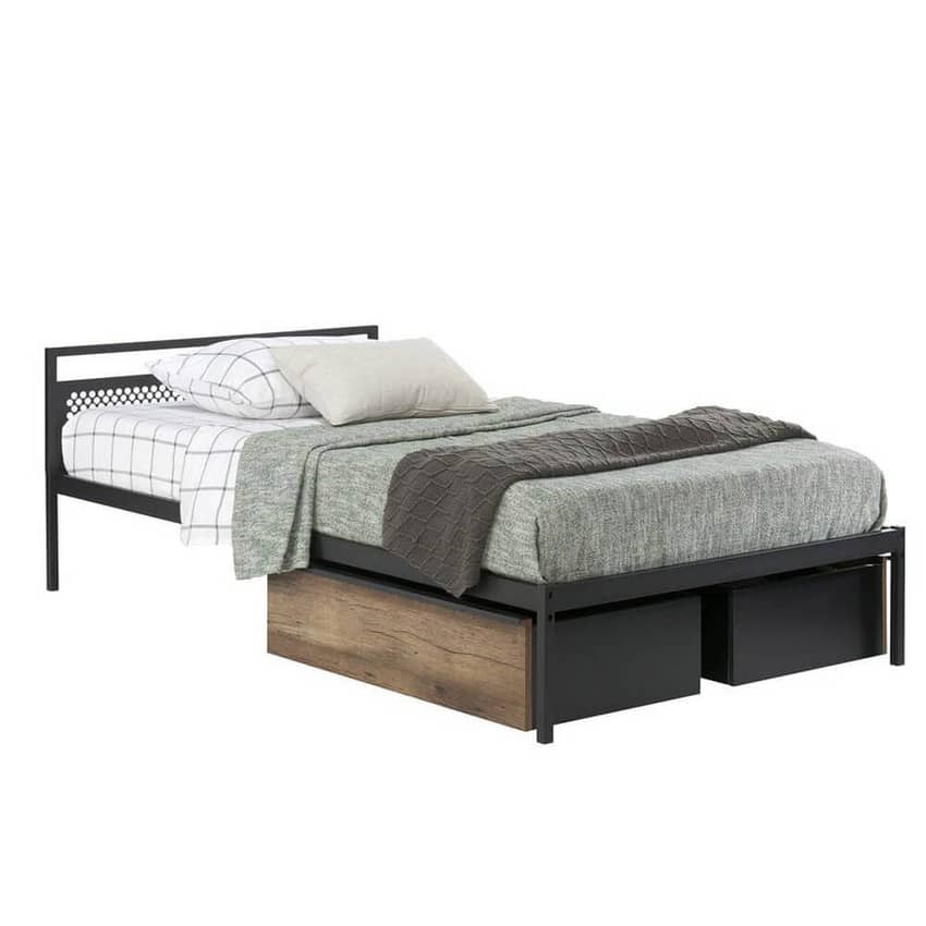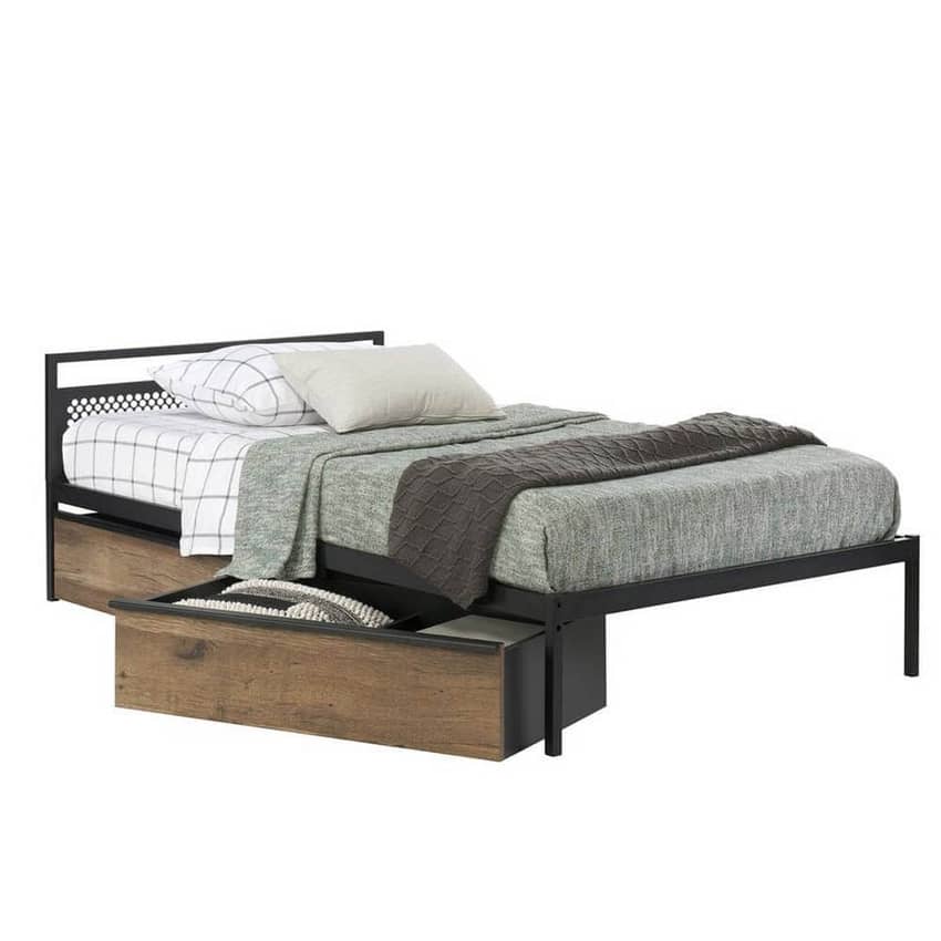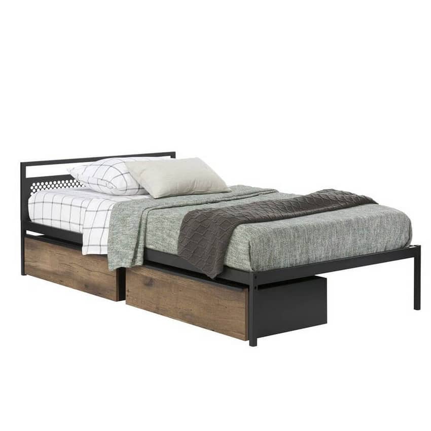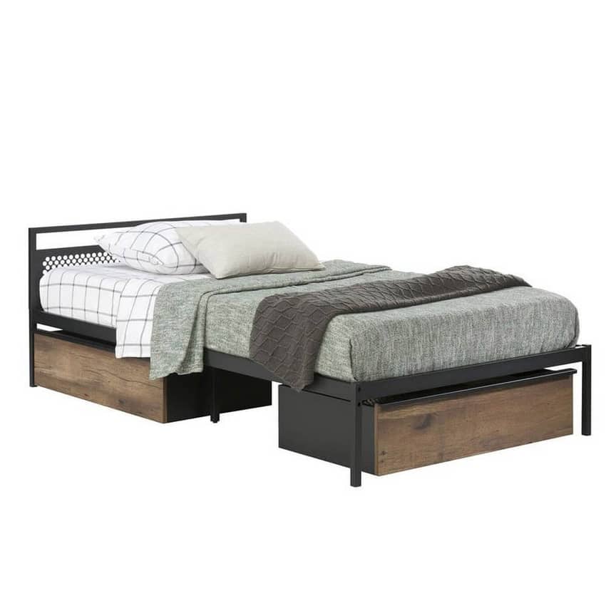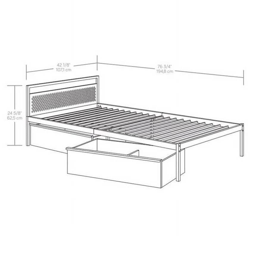 The Sauder Boulevard Cafe Twin Mate's bed is perfect for a child's bedroom or a guest room. It features a modern design with a black finish and vintage oak-colored accents. The bed accommodates a twin-sized mattress and has two convenient drawers with casters for under-bed storage. The drawers can be used on either side of the bed, one on each side, or at the side and foot of the bed. This durable bed frame is made with powder-coated metal construction for durability and is easy to assemble. It has a sleek and modern design that will complement any bedroom decor. The bed weighs 96.8 pounds and measures 76.7 inches long, 42.2 inches wide, and 24.6 inches high.