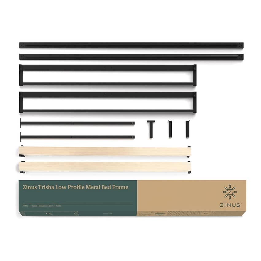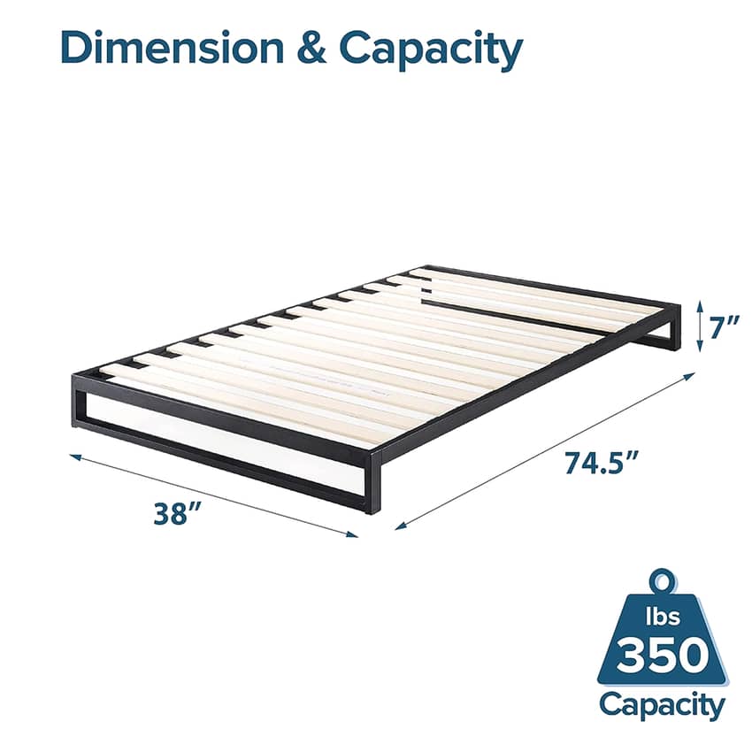 The Zinus Trisha 7-inch Metal Platform Bed Frame in Black offers a modern and minimalist sleeping solution for a twin-sized mattress. Its clean metal frame design adds a contemporary style to any bedroom, while the reliable wooden slat foundation provides optimal support, eliminating the need for a box spring. The 7-inch platform height is ideal for taller mattresses or those who prefer a lower bed profile, and the 5.15-inch clearance underneath offers convenient under-bed storage. Constructed with closely spaced wood slats, this frame extends the life of latex, memory foam, or spring mattresses, supporting a maximum weight capacity of 350 pounds. Easy to assemble, this durable frame provides a sturdy and stylish base for a comfortable night's sleep. This bed frame weighs 22 pounds, has a weight capacity of 350 pounds, and measures 74.5 inches long, 38 inches wide, and 7 inches high.