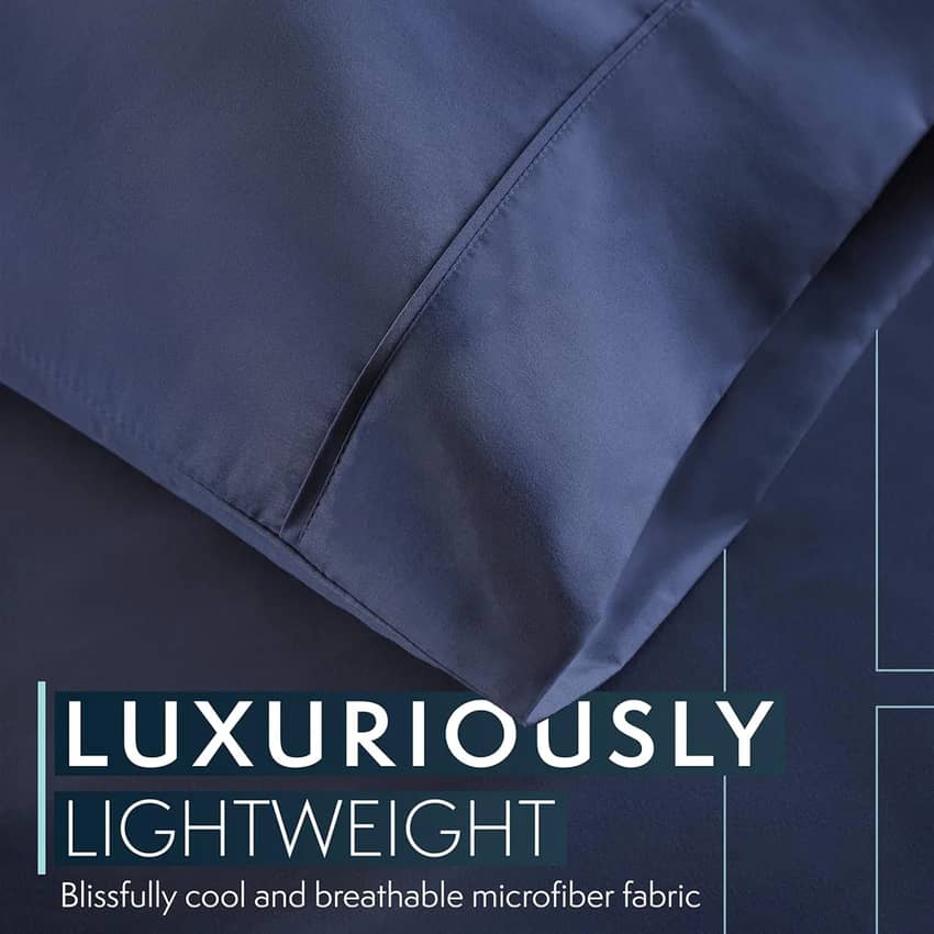 Experience year-round comfort with the HC Collection 3-Piece Microfiber Sheet Set in Navy Blue. Crafted from breathable microfiber, these sheets provide warmth in winter and a cooling sensation in summer. Enjoy a fade-resistant color that maintains its vibrancy through countless washes. This set includes a fitted sheet with deep pockets to fit mattresses up to 16 inches, a flat sheet, and two pillowcases. Machine washable for easy care, this sheet set offers luxurious comfort and effortless maintenance. These sheets have a thread count of 1800, each pillowcase measures 20 by 30 inches, the flat sheet measures 96 by 66 inches, and the fitted sheet measures 75 by 39 inches with pockets that fit up to 16 inches.