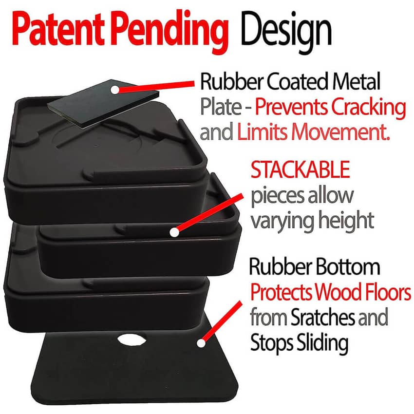- Patent Pending Durable ABS Plastic Made Stackable Riser With Fully Padded Bottom: To increase the elevation, the furniture risers are designed with stackable engineering to securely stack the heavy-duty riser on the additional riser to safely handle the weight without occurring any dent or crack on hardwood or hard surfaces