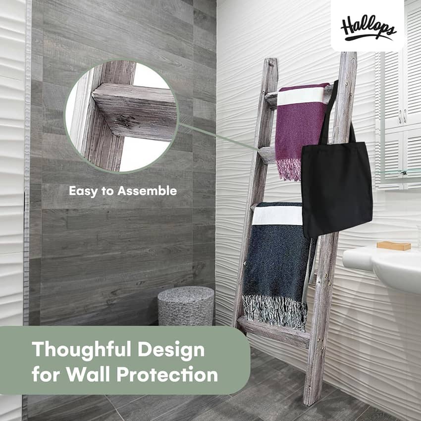 The Hallops Blanket Ladder in Gray offers a stylish and sustainable solution for organizing your living room. Crafted from environmentally friendly and ethically sourced real wood, this farmhouse blanket ladder is a testament to Hallops' commitment to responsible practices. Its vintage gray finish perfectly complements farmhouse home decor, adding a touch of rustic charm to any space. A clear coating ensures long-lasting durability and prevents snagging, keeping your blankets and quilts in pristine condition, and a perfect housewarming or holiday gift! This blanket ladder measures 19.6 inches long, 2.7 inches wide, and 58.6 inches high.