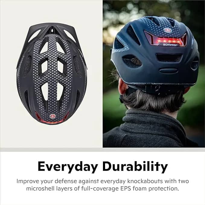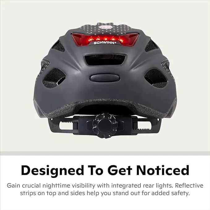 Cruise safely and comfortably with the Schwinn Adult Beam Helmet. This sleek black helmet, ideal for riders 14 and older, features a built-in rear LED light for enhanced nighttime visibility. The light detaches easily for daytime use or battery changes, and reflective strips on the top and sides provide additional low-light safety. Finding the perfect fit is a breeze with the adjustable dial-fit system that offers 360-degree customization. Stay cool on hot rides with 17 strategically placed vents, while adjustable side straps and a detachable visor ensure a comfortable and personalized experience. Weighing a mere 12.8 ounces and measuring 14.9 inches long by 8.46 inches wide by 6.31 inches high, the Schwinn Beam Helmet is a lightweight champion for safety and comfort.