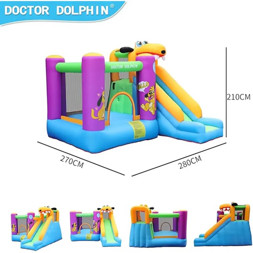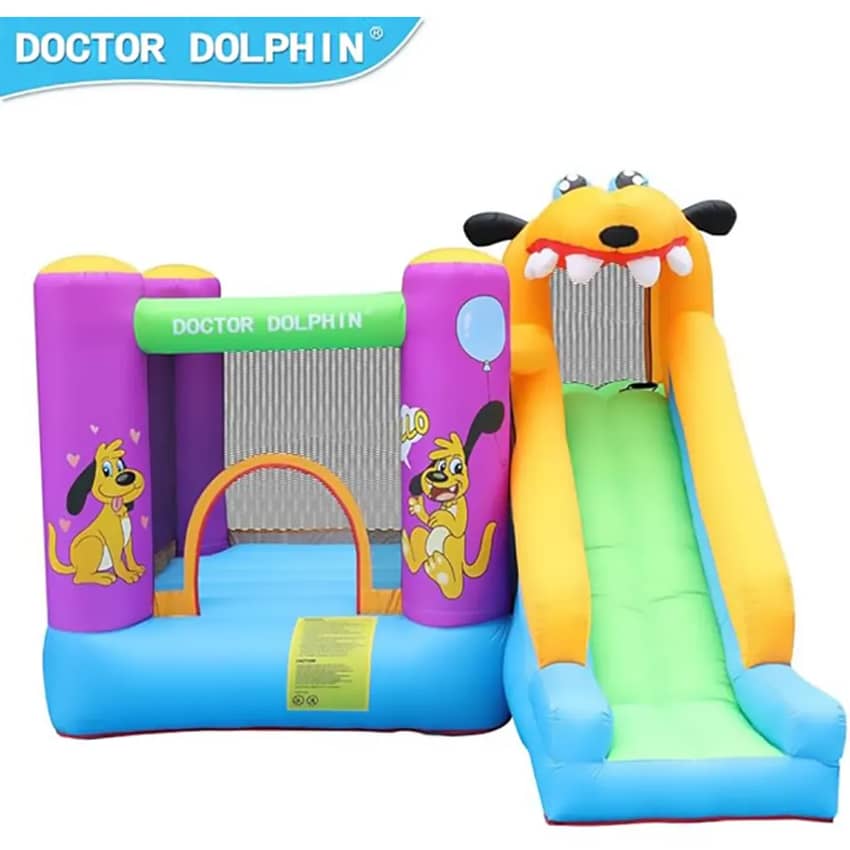 Your kids wil have hours of bouncing fun for your children with the Doctor Dolphin Bounce House with Puppy Slide! This inflatable paradise inflates quickly and easily in just three minutes, providing hours of entertainment outdoors. Accommodating three to four children with a weight capacity of 200 pounds, it's perfect for backyard parties or playdates. Featuring a unique design with a playful puppy atop the Doctor Dolphin bounce house, it's sure to capture children's imaginations. Safety is a priority, with high mesh walls surrounding the large jumping area and railings on both sides of the slide to prevent falls. Constructed with high-quality, puncture-resistant nylon fabric and reinforced stitching, this bounce house is built to last. For easy storage and portability, the Doctor Dolphin Bounce House with Puppy Slide deflates just as fast and comes with a convenient carrying bag. The included 450-watt blower inflates the bounce house quickly, and a patch kit and stakes are included for added convenience. This bounce house weighs 38.9 pounds and measures 9 feet long, 8.8 feet wide, and 6.8 feet high.