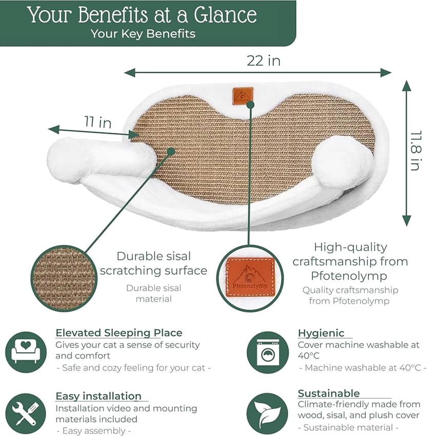 - The cat lounge is constructed with metal supports and reinforced castors, thus offering high protection and stability. The cat lounge for the wall is therefore suitable for adult cats up to 10 kg (~22 lbs)