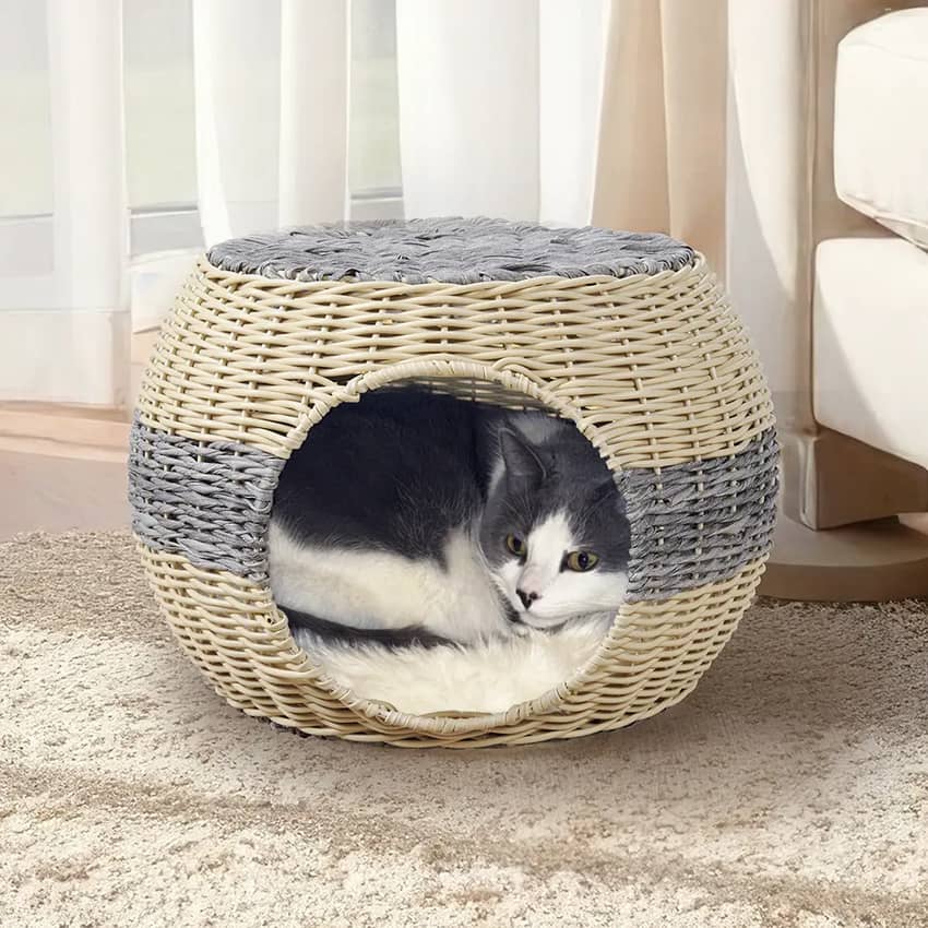 - Features a woven rattan cave, providing a cozy, enclosed space.