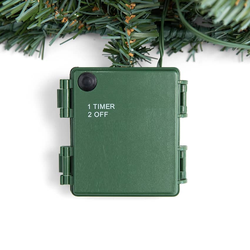 - Garland is pre-lit with 100 warm white LED bulbs for a warm and inviting glow. Includes a built-in timer for 6 hrs. on, 18 hrs. off operation