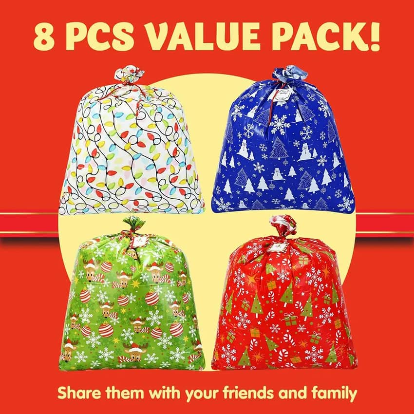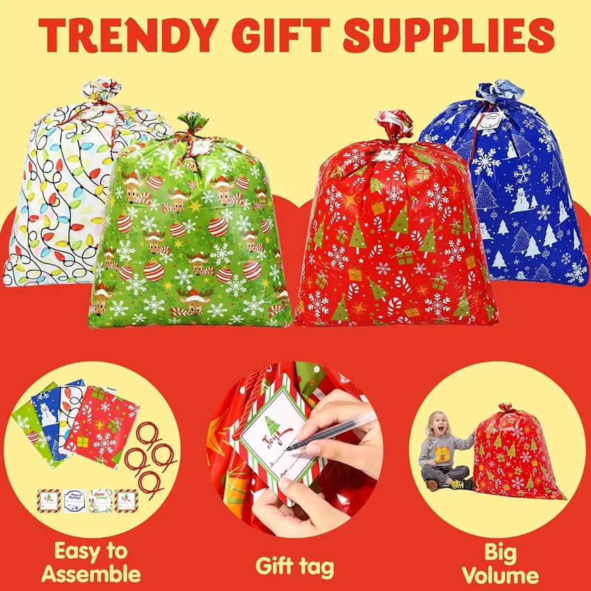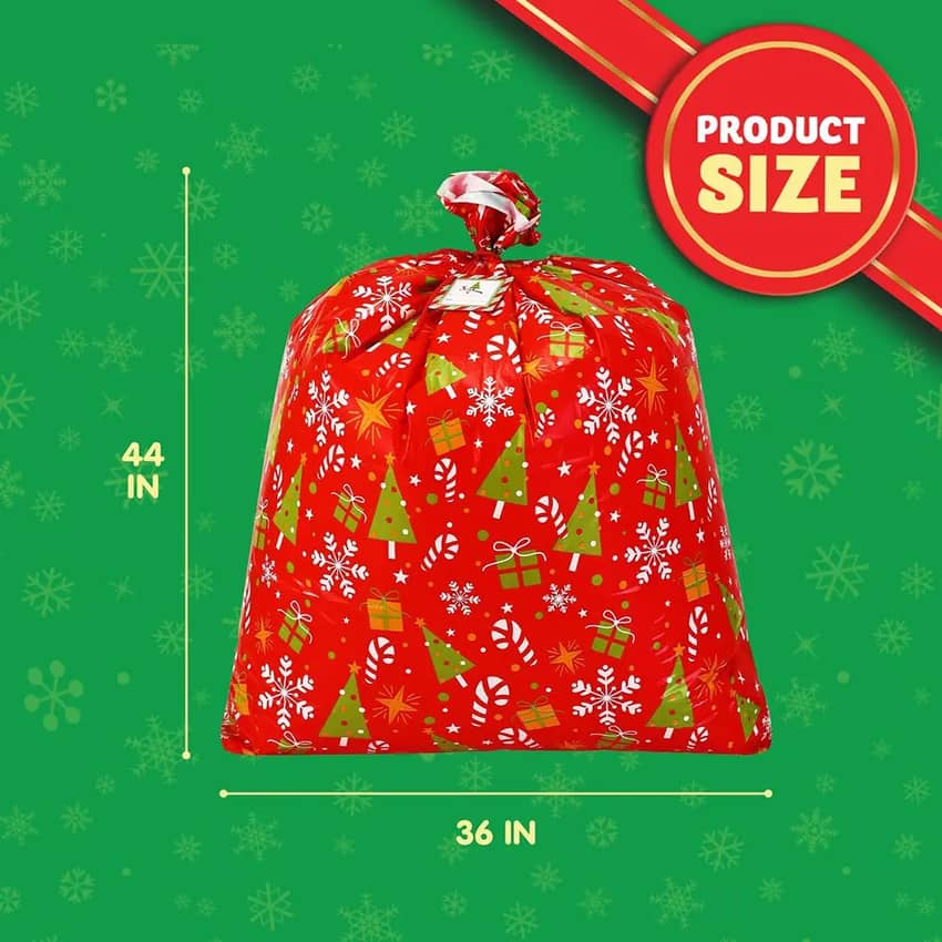 - Eye-catching and festive Christmas design will create an exciting buzz around the house for friends & family. Convenient to use and customize with gift tag and string! Perfect for bulk stuffing, huge sack decor or Christmas presents decorations. Make wrapping presents super easy with no mess!