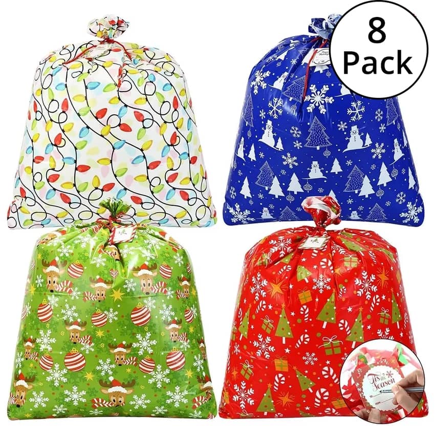 - Extra-Large Christmas bag set includes 8 bags with 4 designs (2 each) & gift tags to personalize your present