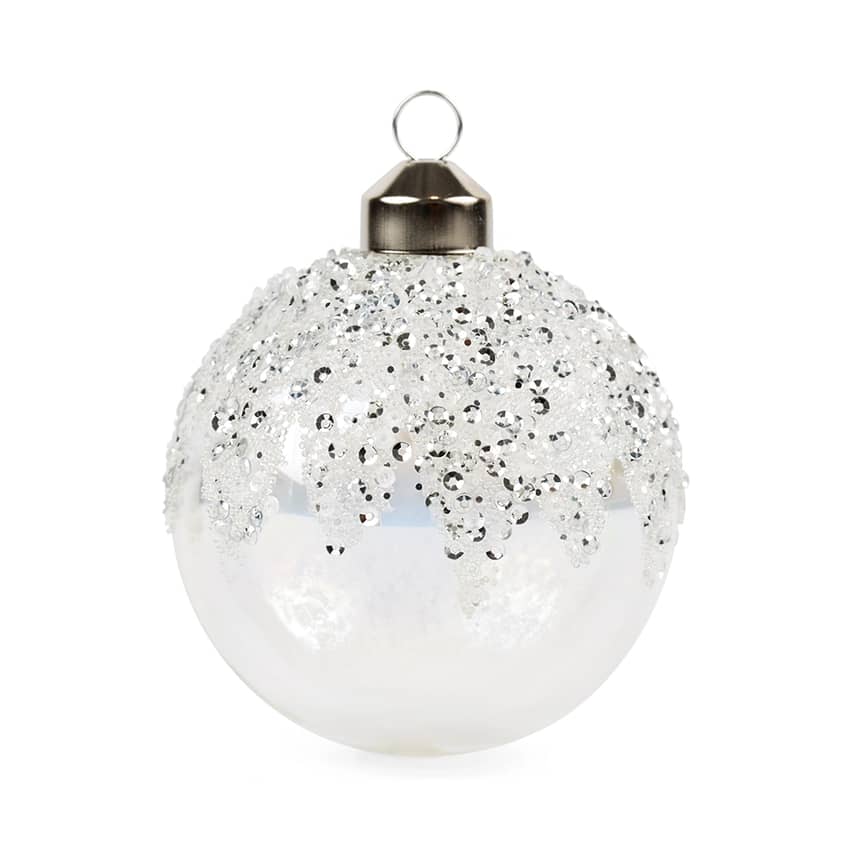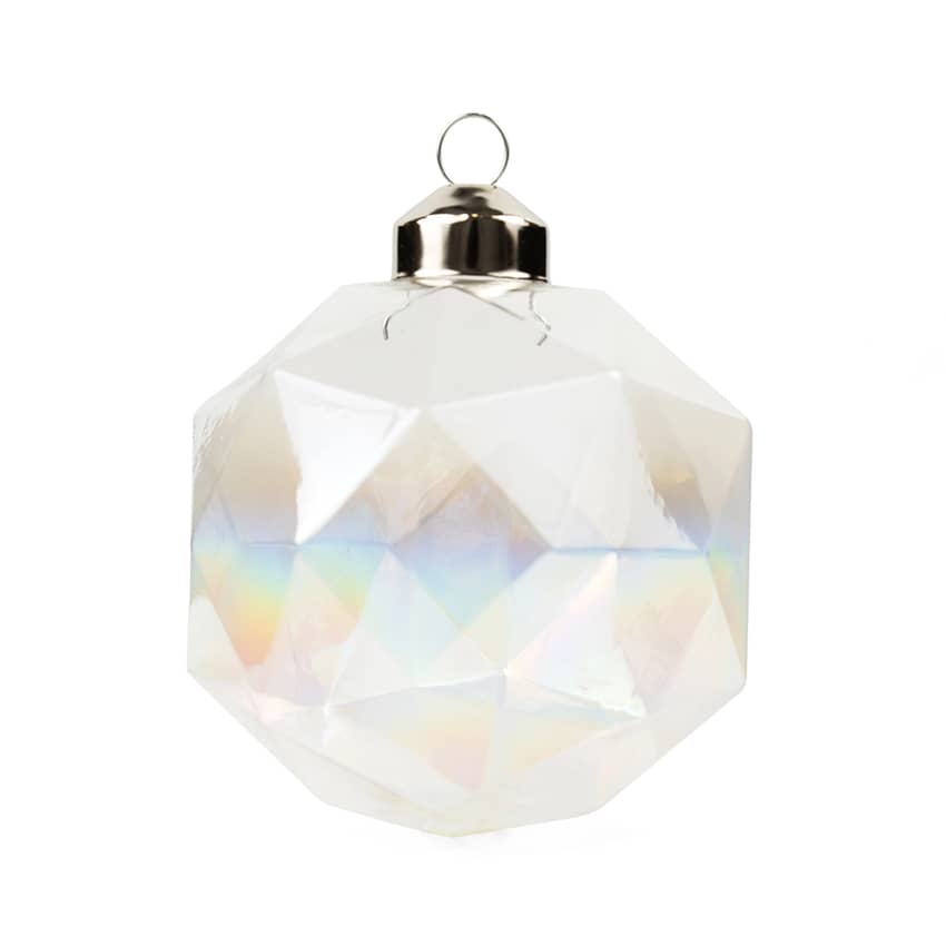 - A beautiful assortment of iridescent and crystal-shaped glass ornaments with matching silver hardware and ribbon hangers