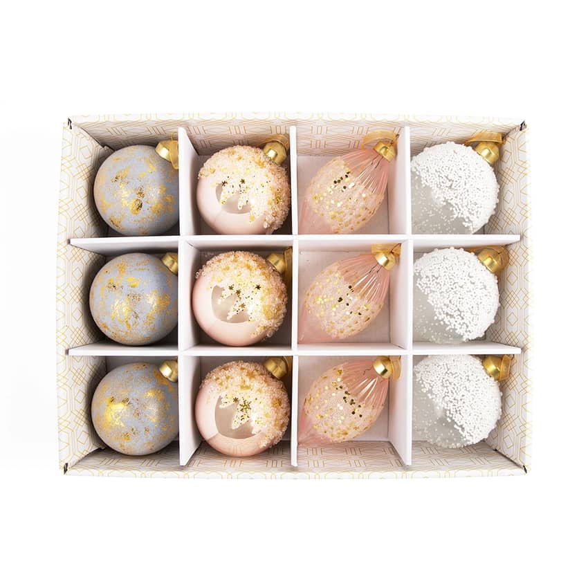 - A beautiful assortment of blush pink and soft gray ornaments with matching gold hardware and ribbon hangers.
