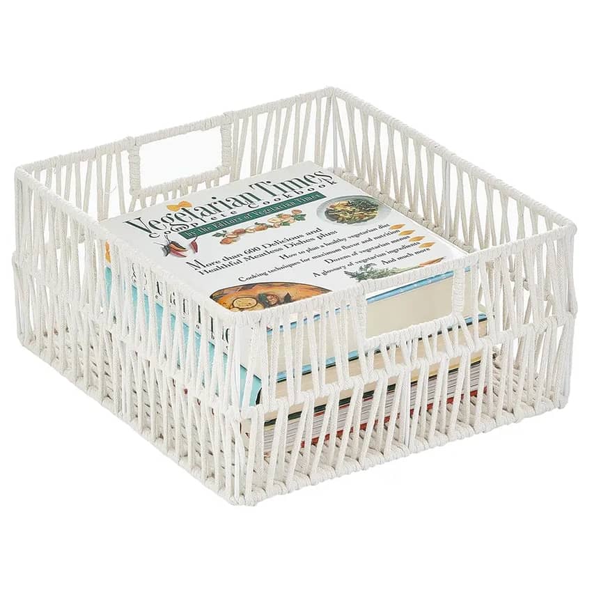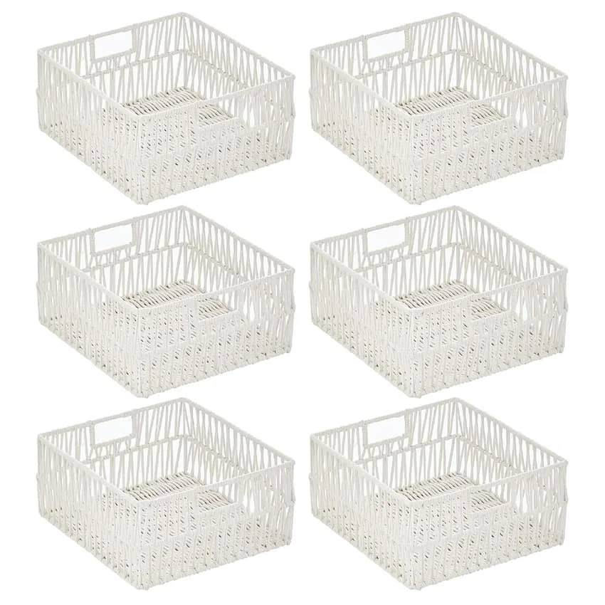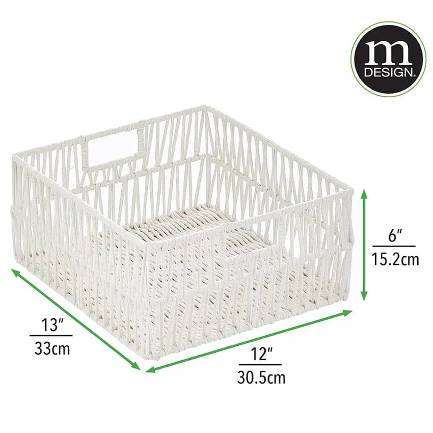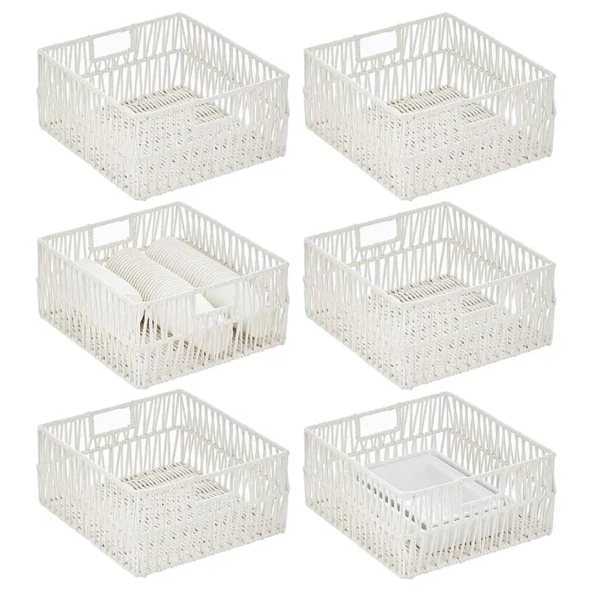 Bring a touch of elegance and organization to your home with the mDesign Cotton Macrame Storage Basket 6-pack. These decorative yet functional baskets are expertly crafted from sturdy metal wire artfully wrapped in soft cotton rope, designed to effortlessly blend with any decor. Ideal for keeping kitchen and pantry clutter at bay, their integrated, built-in handles make it simple to pull them on and off shelves, while the open tops allow for quick visibility and access to your essentials. Use them together for a unified organizational system or separate them to add coordinated storage throughout your kitchen, pantry, living room, family room, or mudroom. To maintain their beauty, simply clean with a damp cloth; just remember, these are not intended for food storage.