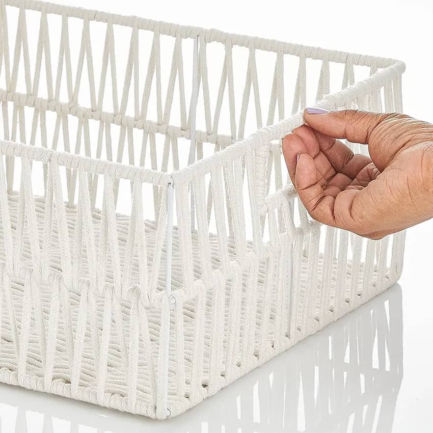 - Beautifully crafted from sturdy metal wire and artfully wrapped in cotton rope, these textured baskets are designed to complement any decor