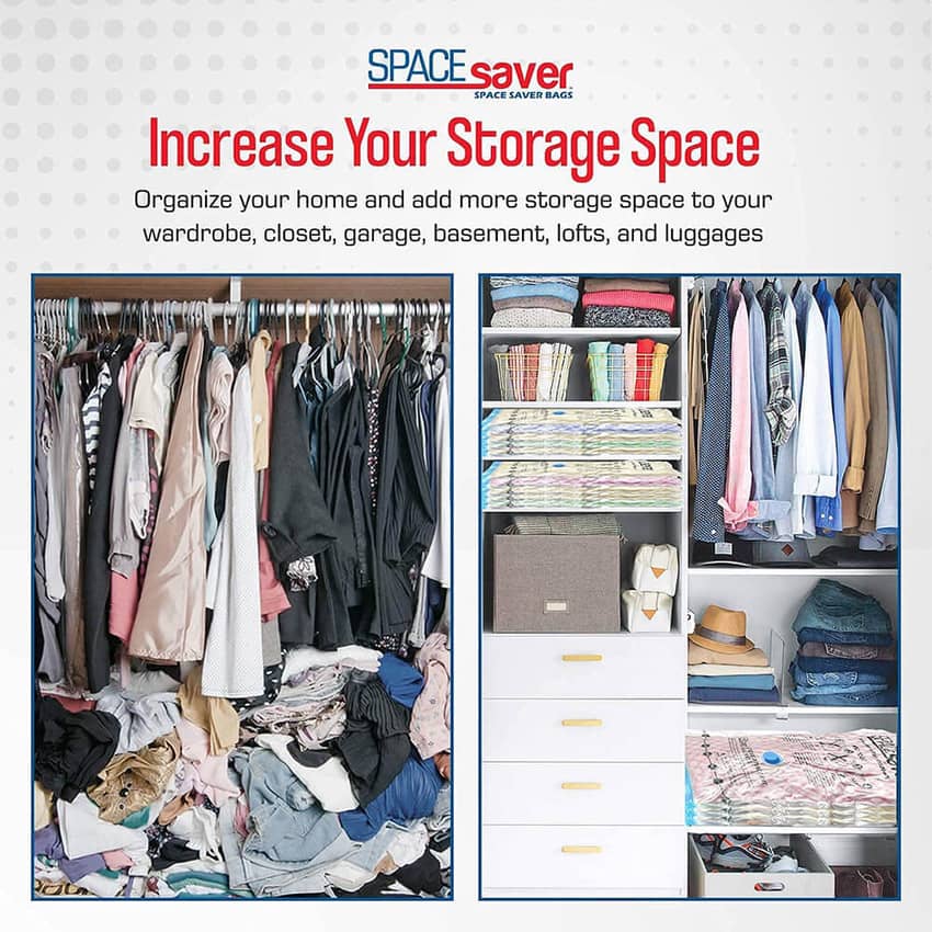- Increase Your Storage Space by 80%: Without even having to clean out your closet! Our space-saver bags are an ideal solution for adding more storage space to your wardrobes, closets, garages, basements, lofts, and suitcases