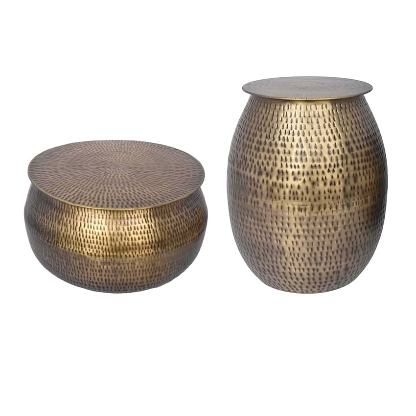 This elegant coffee table and side table set brings a touch of sophisticated style to any living space with its unique brass finish and hammered metal exterior. Each piece is expertly crafted from mild steel into a distinctive drum shape, offering both visual interest and sturdy construction. The set includes a spacious coffee table perfectly complemented by a convenient side table. This versatile duo is ideal for anchoring your seating area, providing ample surface space, and adding a refined brass accent to your home. The coffee table measures 30 inches in diameter and 15.5 inches high, and the side table measures 15 inches in diameter and 18 inches high.