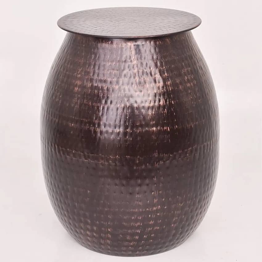 - Crafted from mild steel, this table set features a drum shape with a hammered exterior