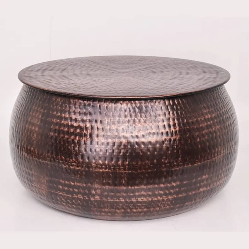 Enrich your living space with the distinctive charm of the Hammered Metal Coffee Table and Side Table Set in Bronze. Crafted from durable mild steel, each piece showcases a unique drum shape with an eye-catching hammered exterior, adding textural interest and a touch of rustic elegance to your decor. The coffee table provides a perfect centerpiece, while the accompanying side table offers a convenient and stylish accent. With their rich bronze finish and robust metal construction this set is ready to transform your living room into a sophisticated and inviting haven. The coffee table in this set measures 30 inches in diameter and 15.5 inches high, and the side table measures 15 inches in diameter and 18 inches high.