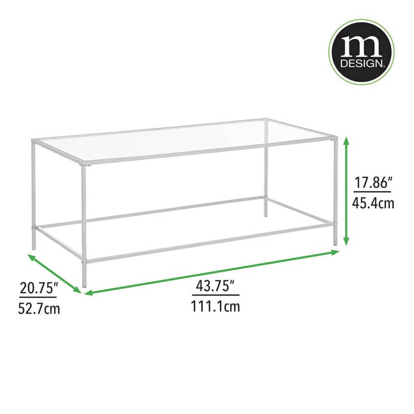 The mDesign glass-top coffee table is a versatile and stylish table that can be used in any room in your home. It has a sleek, modern design with a silver metal frame and a glass top. This table is compact enough to fit into small spaces but provides ample space for books, magazines, laptops, and other items. It measures 43.75 inches long, 20.75 inches deep, and 17.86 inches high.