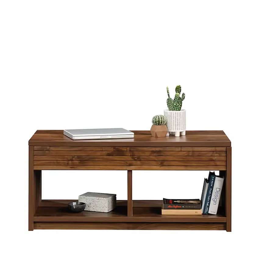 The Origin 21 Lift Top Coffee Table with Storage in a Dark Walnut is a versatile and stylish addition to any living space. Its lift-top design allows you to easily adjust the height of the table, transforming it from a coffee table to a dining or work surface. The hidden interior storage compartment provides ample space for books, magazines, or remote controls, while the open shelves offer additional storage and display options. Crafted with a durable dark walnut finish, this coffee table combines functionality and style to enhance your living room decor. This coffee table weighs 68 pounds, the lift top measures 24.63 inches, and the table measures 43.1 inches long, 19.13 inches wide, and 18.9 inches high.