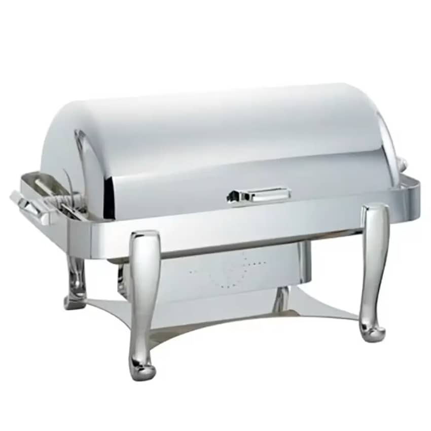 The Oneida Sant' Andrea 8-Quart Ouverture Oblong Roll Top Chafer is a versatile and durable chafing dish perfect for any buffet or catering event. Its 180-degree roll-top cover allows for easy filling and cleaning, while its stainless steel construction ensures long-lasting performance. Designed for both electric and Sterno warming, this chafer offers flexibility in heating options. With a spacious 8-quart capacity and a sleek silver finish, it's a stylish and functional addition to any kitchen or dining area.
