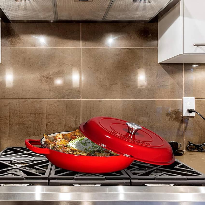 - Set Includes: 3 Quart Cast Iron Enameled Dutch Oven Modern Squoval Shaped Design, with Stainless Steel Knob + 3.8-Quart Enameled Cast Iron Shallow Casserole Braiser Pan with Cover, Cast Iron Covered Casserole Skillet + 10" Enameled Cast Iron Square Casserole Baker With Griddle Lid 2 in 1 Multi Baker Dish