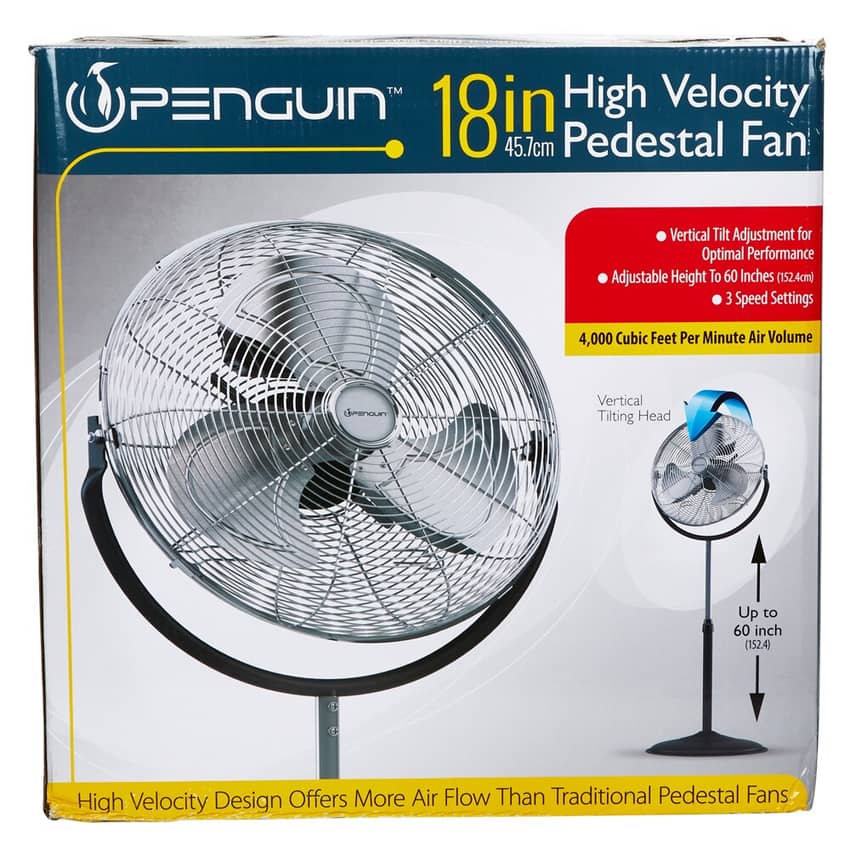 Moving an awesome 4,000 cubic feet of air volume per minute, our exclusive Penguin 18-inch high-velocity pedestal fan can cool down a workspace or room in no time! This durable fan has a powder-coated finish and all-metal construction. The height can be adjusted up to 60 inches, and the vertical tilting head lets you direct the air exactly where you need it. Three-speed rotary switch makes this fan easy to use.