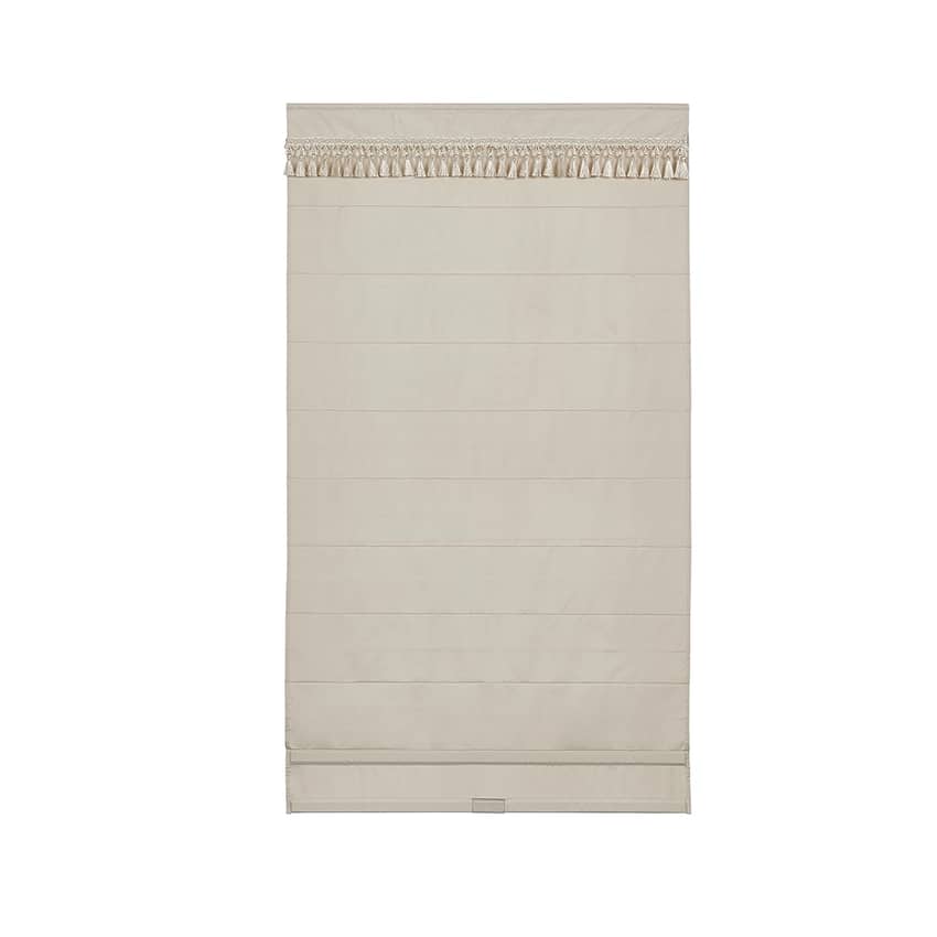 Enrich your home with the luxurious appeal of the Cordless Fabric Flat Roman Shade with Tassel Trim Valance. This elegant shade, in a calm Sand Stone, is crafted from a beautiful polyester faux silk fabric that creates a calm, good-looking atmosphere. Its cordless technology allows you to effortlessly raise and lower the shade by simply holding the bottom rail, making it a safe and convenient choice for homes with children or pets. The shade features a color-coordinating valance with decorative tassel trim and a light-filtering liner on the back for privacy, while the uniform white backing ensures a clean look from the outside. Designed for both inside and outside mounts, it comes with all necessary hardware and a step-by-step instruction manual for easy installation and maintenance. The minimum depth required for an inside mount is 1.25 inches, and for a flush mount, it is 2 inches. For an outside mount, it is recommended that 3 inches be added to the width for full coverage. This shade measures 64 inches long and 36 inches wide.