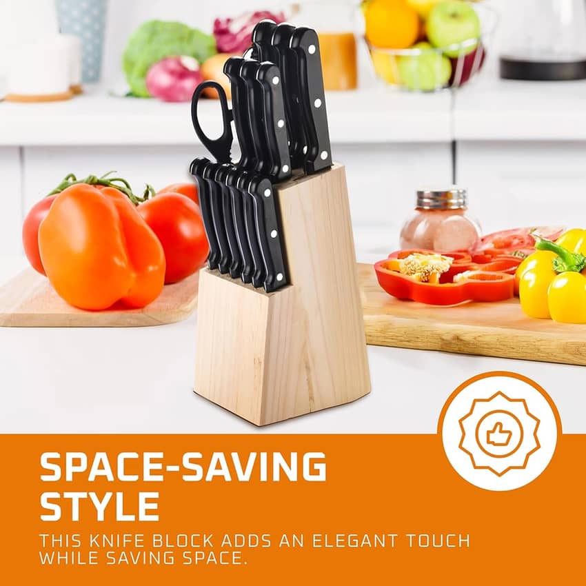 - The knife block adds an elegant touch while saving space. Great for displaying your knives in a trendy way