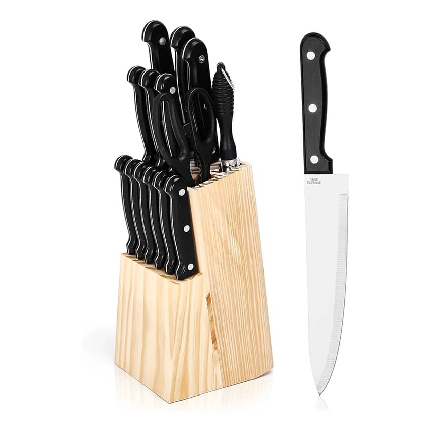 The Bruntmor 15-Piece Cooking Knife Set is a stylish and practical addition to any kitchen. This sleek set features black ceramic-coated blades and matching black handles, offering both modern aesthetics and superior functionality. A standout feature is the built-in sharpener, which eliminates the need for traditional whetstone sharpening, saving you time and effort while keeping your knives in peak condition effortlessly. The included knife block not only provides elegant and efficient storage but also helps save counter space by displaying your knives in a trendy way. Beautifully packaged, this set makes an ideal gift for special occasions like weddings, birthdays, or housewarmings. To maintain their optimal performance, simply hand wash the knives, spot clean, and dry immediately before storing them securely in the wooden block. This knife block measures 4.1 inches long, 6.8 inches wide, and 14.3 inches high.