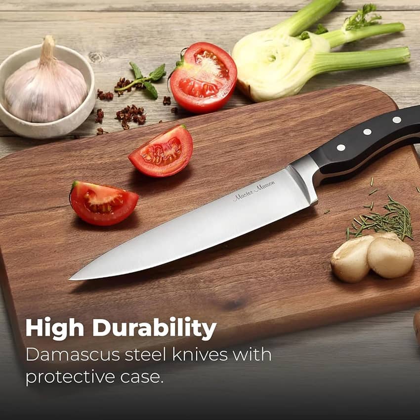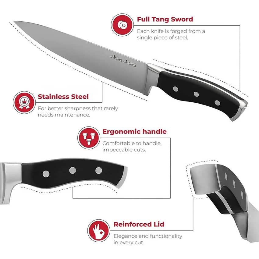 - Comfortable And Balanced Chef Knives: Experience reduced hand fatigue with the ergonomic design of this master maison chef knife; balanced weight offers control for professional-level slicing