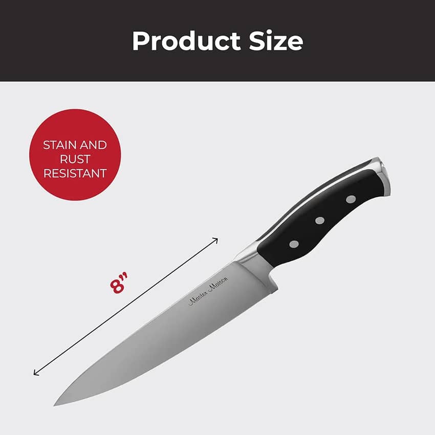 The Master Maison 8-inch Chef Knife is a versatile and high-performance tool for any kitchen. Crafted from premium German stainless steel, this durable knife boasts exceptional sharpness and resistance to rust. The ergonomic design ensures comfortable and balanced handling, reducing hand fatigue during extended use. This comprehensive set includes a protective edge guard, a convenient storage box, and a dual sharpener to maintain the knife's edge, making it a reliable and essential tool for home cooks and professional chefs alike. This knife has a blade length of 8 inches long.
