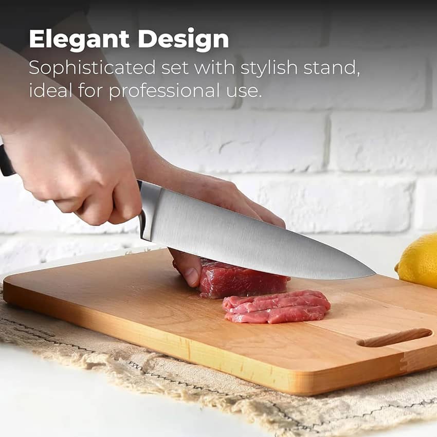 - Durable German Steel Blade: Built from rust-resistant German stainless steel, this kitchen knife with sharpener ensures long-lasting sharpness; a reliable choice for every home cook and chef
