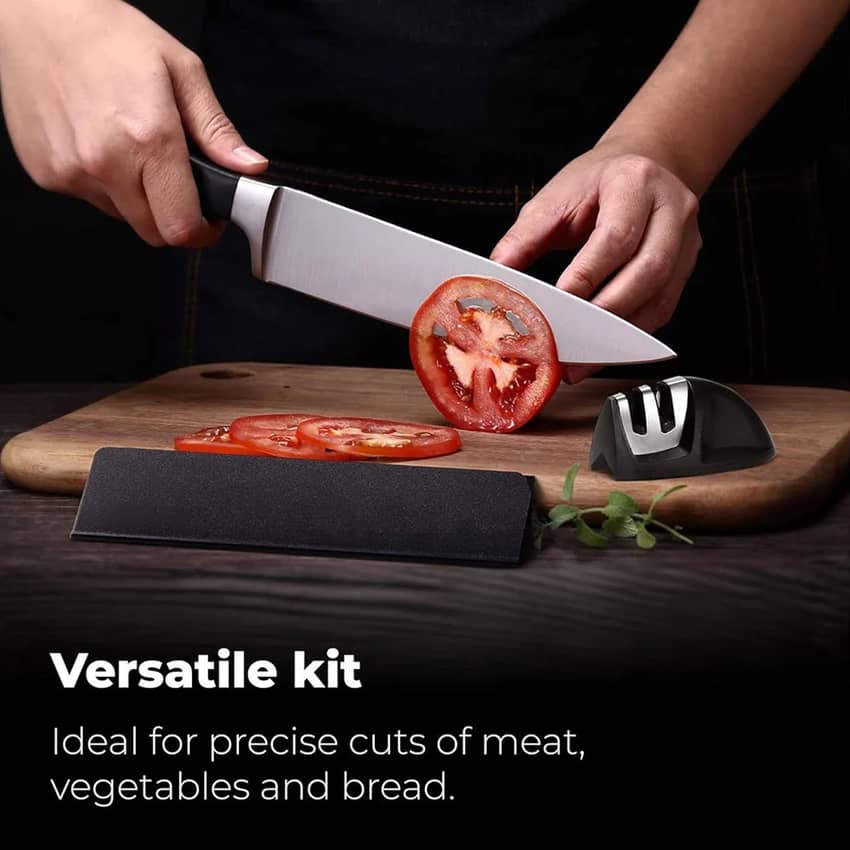 - Complete Set For Kitchen Needs: Includes a protective edge guard and storage box; the dual sharpener keeps this cooking knife with sharpener ready for daily use with a consistently sharp blade