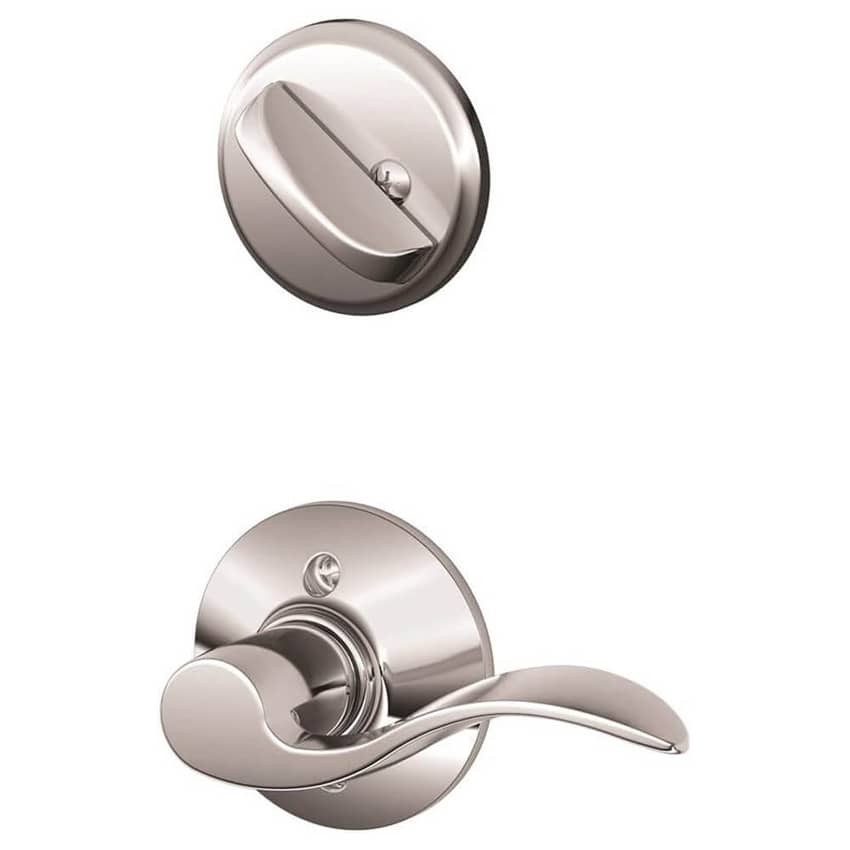 The Schlage Accent interior left-handed door lever with deadbolt in bright chrome is a secure option for interior doors with hinges on the left side when facing the door from the outside. The interior half requires the F58 handleset to complete. The Accent lever features a clean and modern design with smooth lines and subtle elegance. The bright chrome finish complements a variety of decor styles, and the durable metal construction is backed by a Grade 2/AAA certified BHMA rating, ensuring years of dependable use. The deadbolt provides additional security for your home, and the easy installation makes this a great DIY project for homeowners of all skill levels.