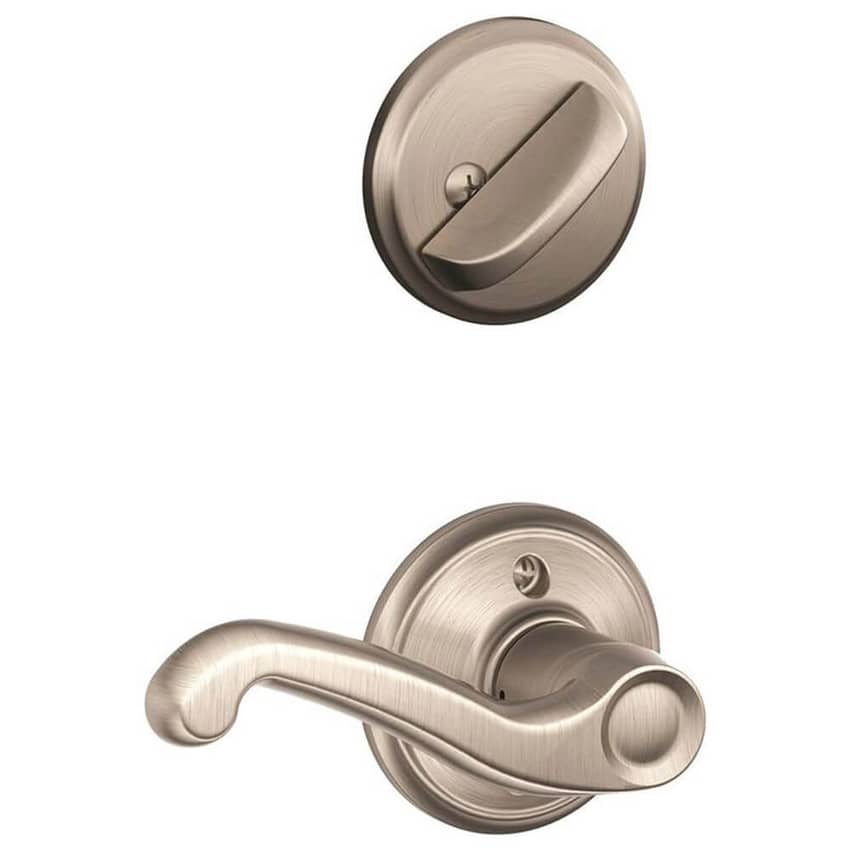 The Schlage Flair interior left-handed door lever with deadbolt in satin nickel is a stylish and secure option for interior doors with hinges on the left side when facing the door from the outside. The interior half requires the F58 handleset to complete. The Flair lever features a unique and eye-catching design with ornate details and a hint of vintage charm. The satin nickel finish complements a variety of decor styles, and the durable metal construction is backed by a Grade 2/AAA certified BHMA rating, ensuring years of dependable use. The deadbolt provides additional security for your home, and the easy installation makes this a great DIY project for homeowners of all skill levels.