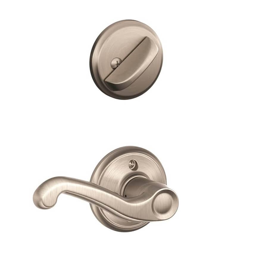 The Schlage Flair interior right-handed door lever with deadbolt in satin nickel is an elegant and secure option for interior doors. The interior half requires the F58 handleset to complete, and the right-handed lever style is designed for doors with hinges on the right side when facing the door from the outside. A minimum center-to-center door prep of four inches is required for this two-piece model. The Flair lever features a unique and eye-catching design with ornate details and a hint of vintage charm. The satin nickel finish complements a variety of decor styles, and the durable metal construction is backed by a Grade 2/AAA certified BHMA rating, ensuring years of dependable use. The deadbolt provides additional security for your home, and the easy installation makes this a great DIY project for homeowners of all skill levels.